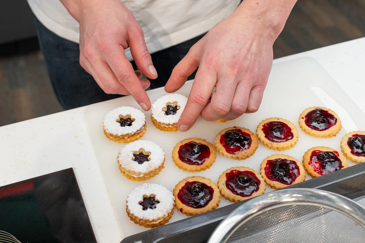 Печенья с дырочками посыпать сахарной пудрой. Цельное печенье намазать джемом, оставляя в центре печенья больше начинки, чем по краям. Сверху положить присыпанное пудрой дырявое печенье.