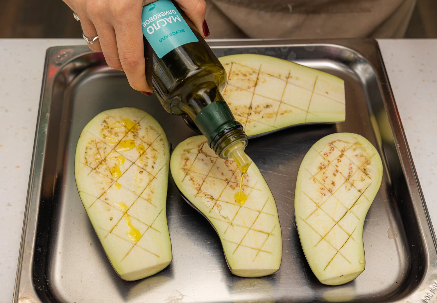 Разрежьте баклажаны вдоль на две половинки. На внутренней части с помощью ножа сделайте «сеточку» и смажьте мякоть растительным маслом. Поставьте в духовку, разогретую до 180 °C, и запекайте 15–20 минут.