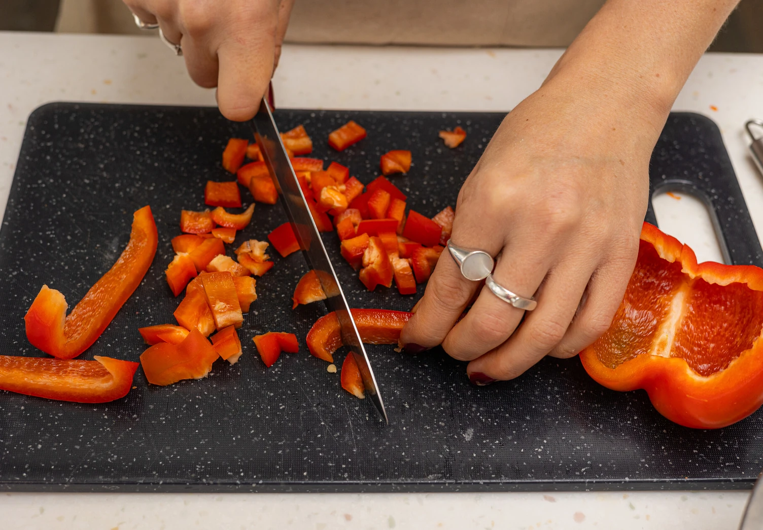 Пока баклажаны готовятся, мелко нарежьте все овощи, кроме помидоров.
