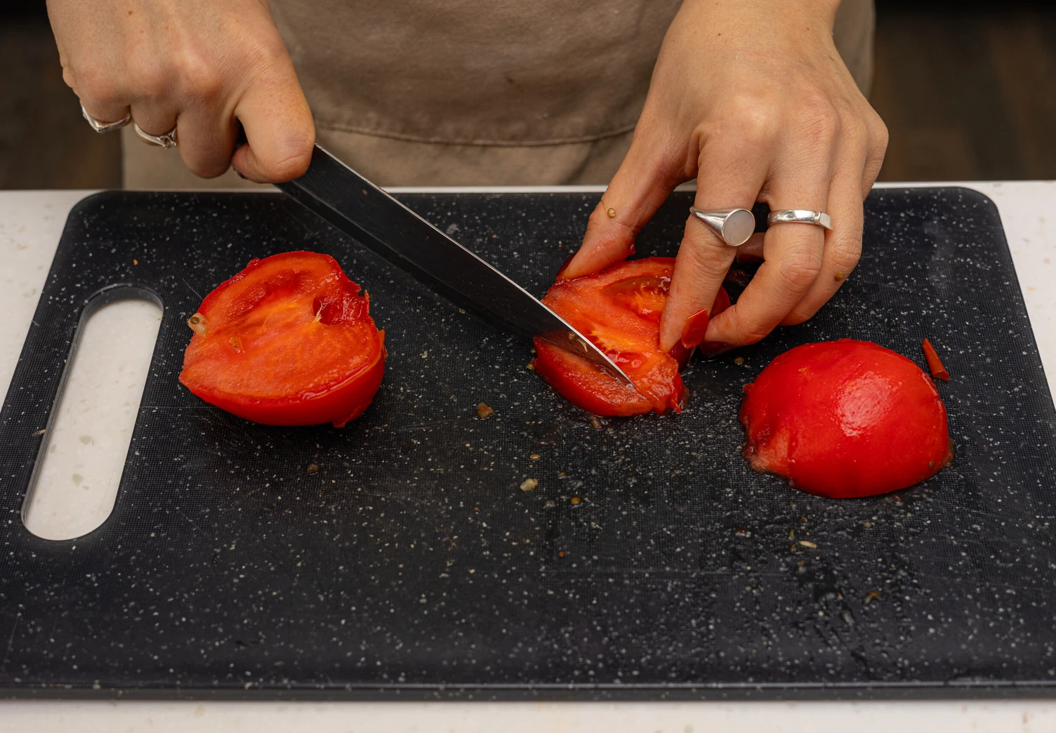 Сделайте на помидорах крестовидные надрезы, обдайте плоды кипятком и снимите с них кожицу. Затем нарежьте мякоть мелкими кубиками. Можно также использовать готовые томаты типа пассата.