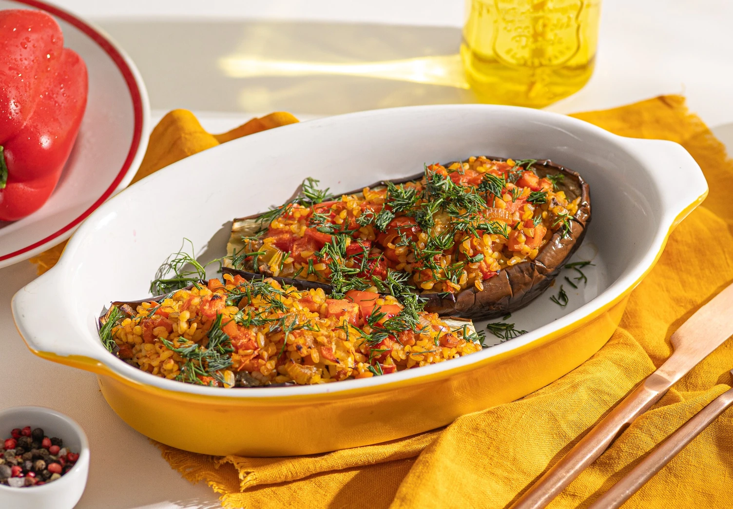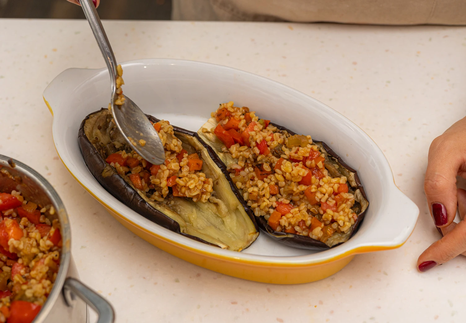 Смешайте овощи с отварным булгуром и положите эту массу в лодочки из баклажанов. Отправьте их в духовку, разогретую до 180 °C, на 10–15 минут.