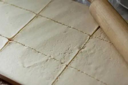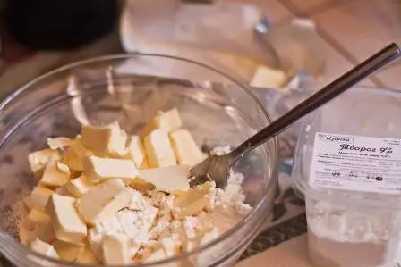 Творог, порезанное кусочками масло, муку и яйцо положите в миску и рубите ножом до получения теста, оставьте постоять 2 часа в холодильнике.