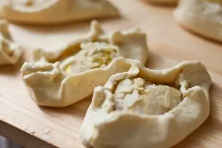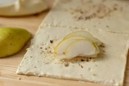 В центр каждого квадрата положите тонко нарезанную грушу, чуть присыпьте сахаром и сверху миндальные лепестки.