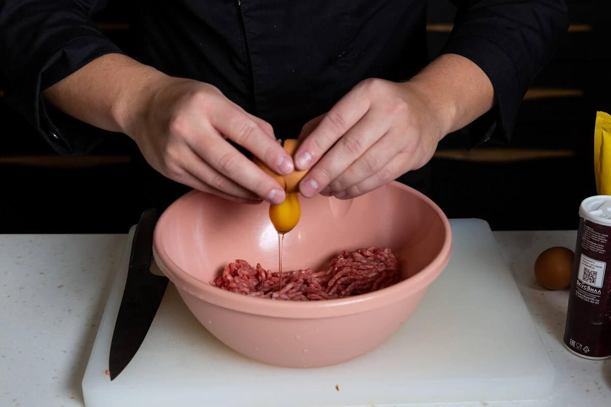 Фарш выложите в миску, добавьте 1 яйцо, кукурузный крахмал, соль, перец и перемешайте.