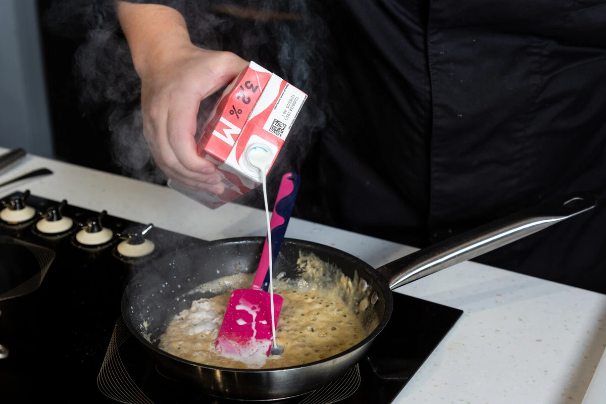 Сделайте соус. В мясной сок, который остался после жарки котлет, добавьте сливочное масло и муку. Готовьте, помешивая, до золотистого цвета. Влейте молоко, перемешайте до однородности и готовьте ещё немного, чтобы получился однородный густой соус. Добавьте щепотку соли.