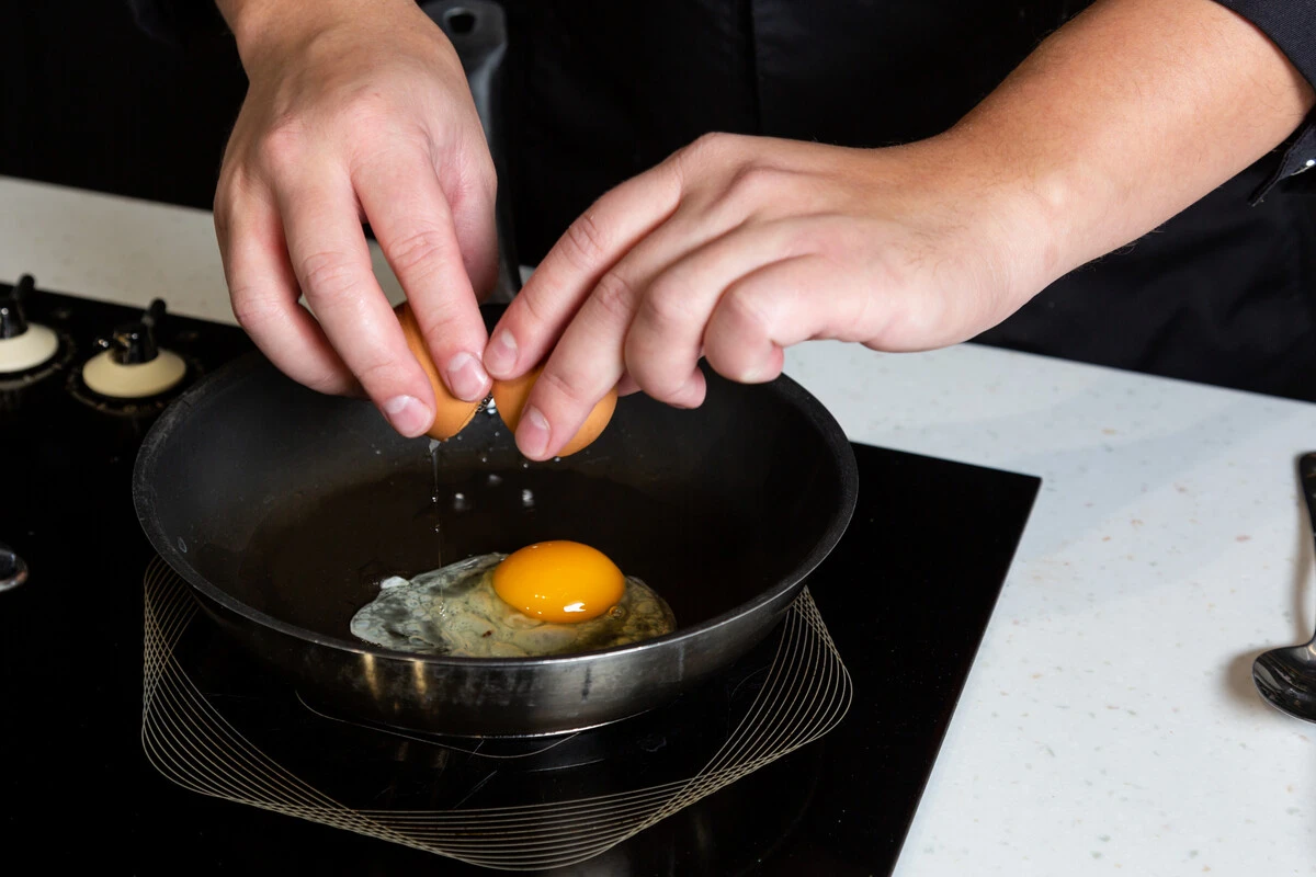 Разогрейте другую сковороду с небольшим количеством масла. Пожарьте 4 яйца по отдельности — у вас получится 4 яичницы-глазуньи.