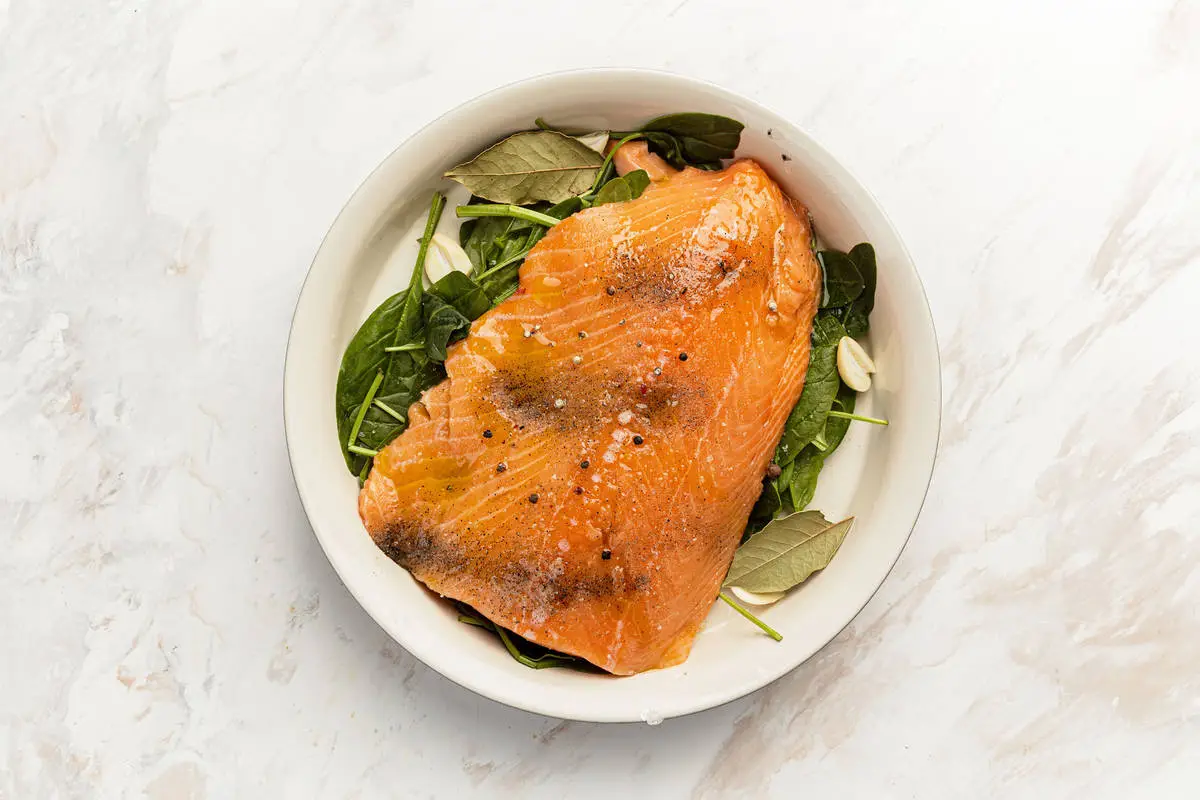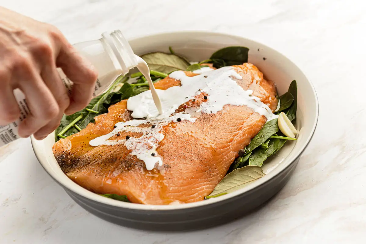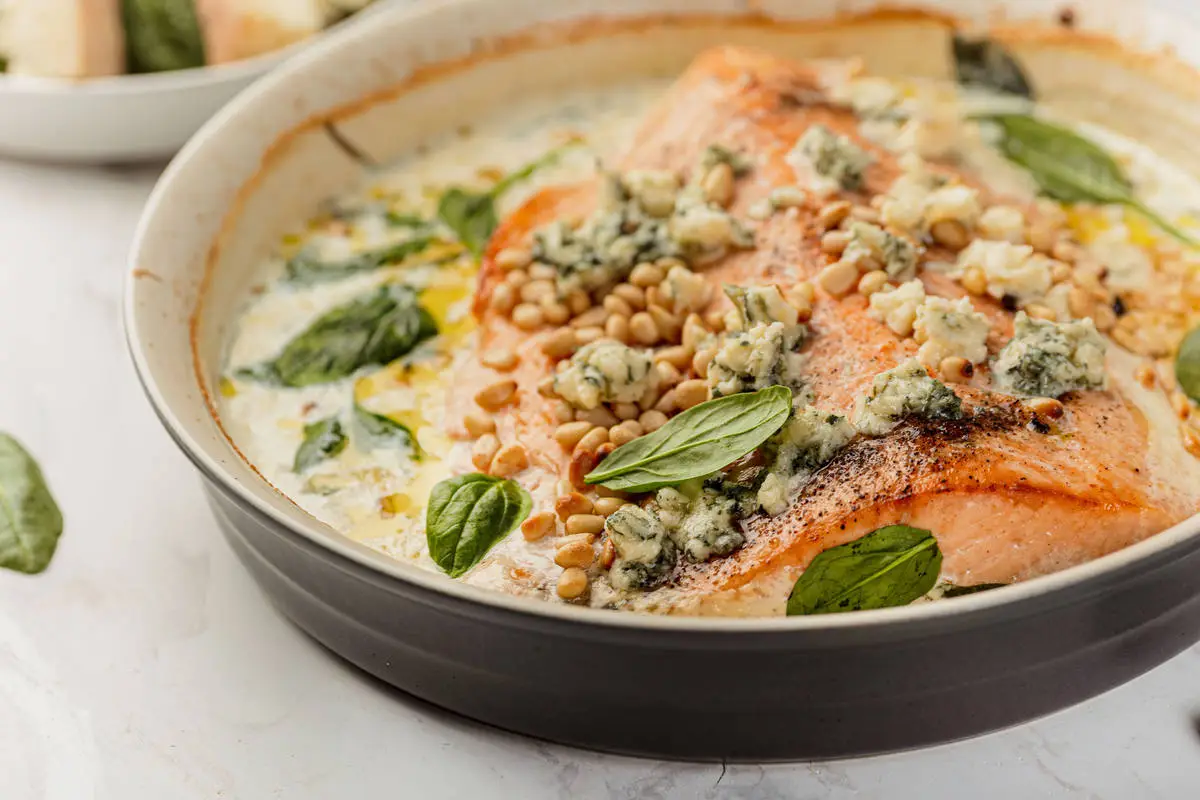 Лосось в сливочном соусе со шпинатом и голубым сыром
