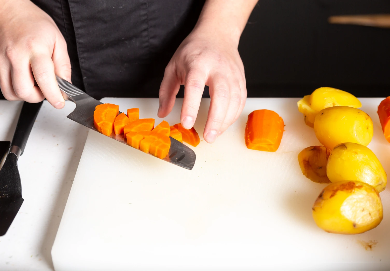 Морковь и картофель положите в рукава для запекания и готовьте в духовке при 200 градусах в течение 20–25 минут.