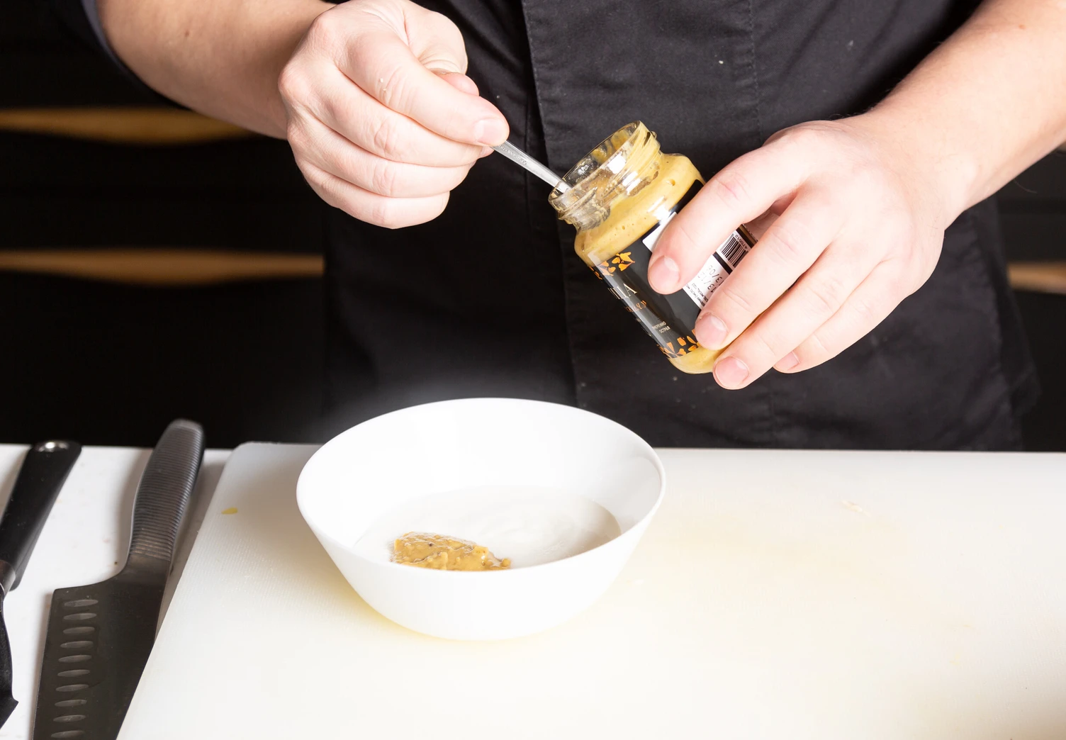 Соедините все ингредиенты и заправьте их сметаной с горчицей.