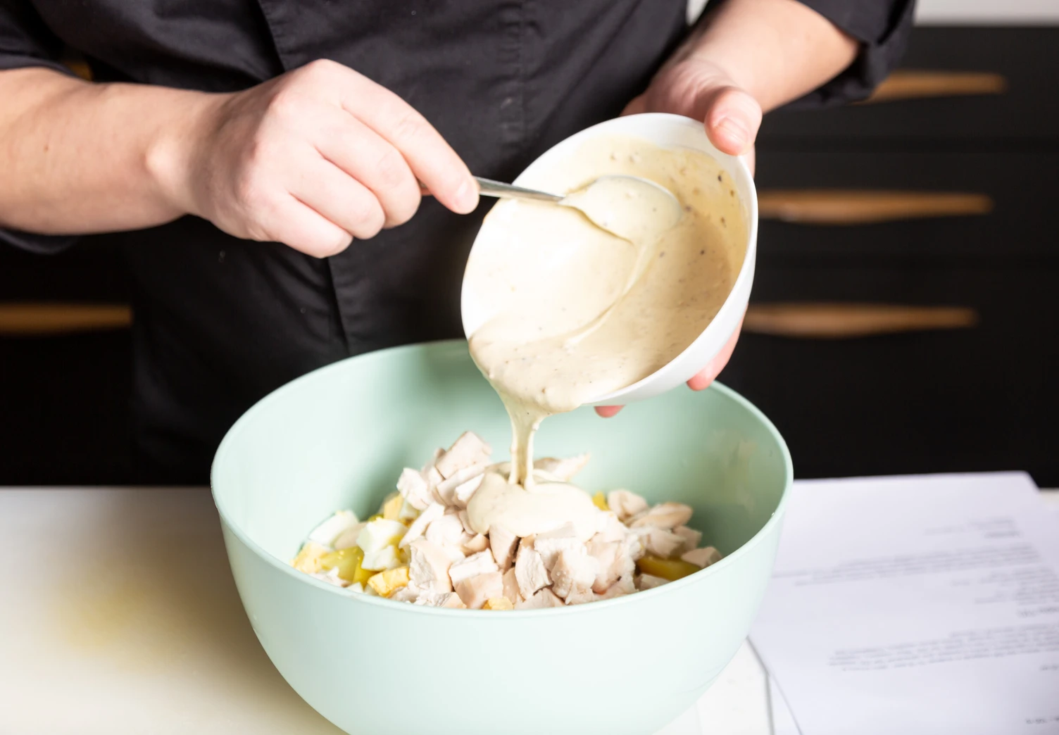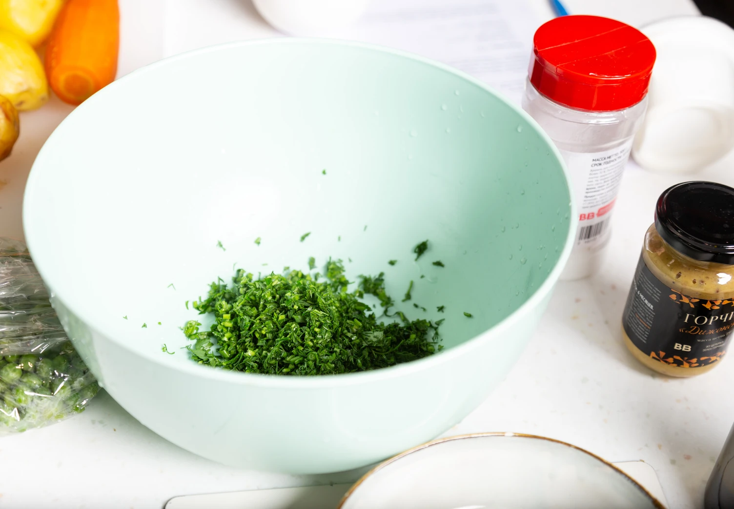 В этом рецепте мы заменили консервированные овощи свежими, колбасу — куриной грудкой, а майонез — лёгкой заправкой со сметаной и горчицей. Салат стал полезнее, а вкус не пострадал.