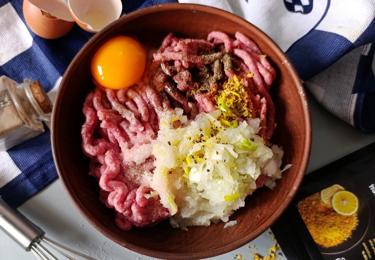 Тщательно смешайте все ингредиенты и хорошо отбейте мясо для получения однородной текстуры.