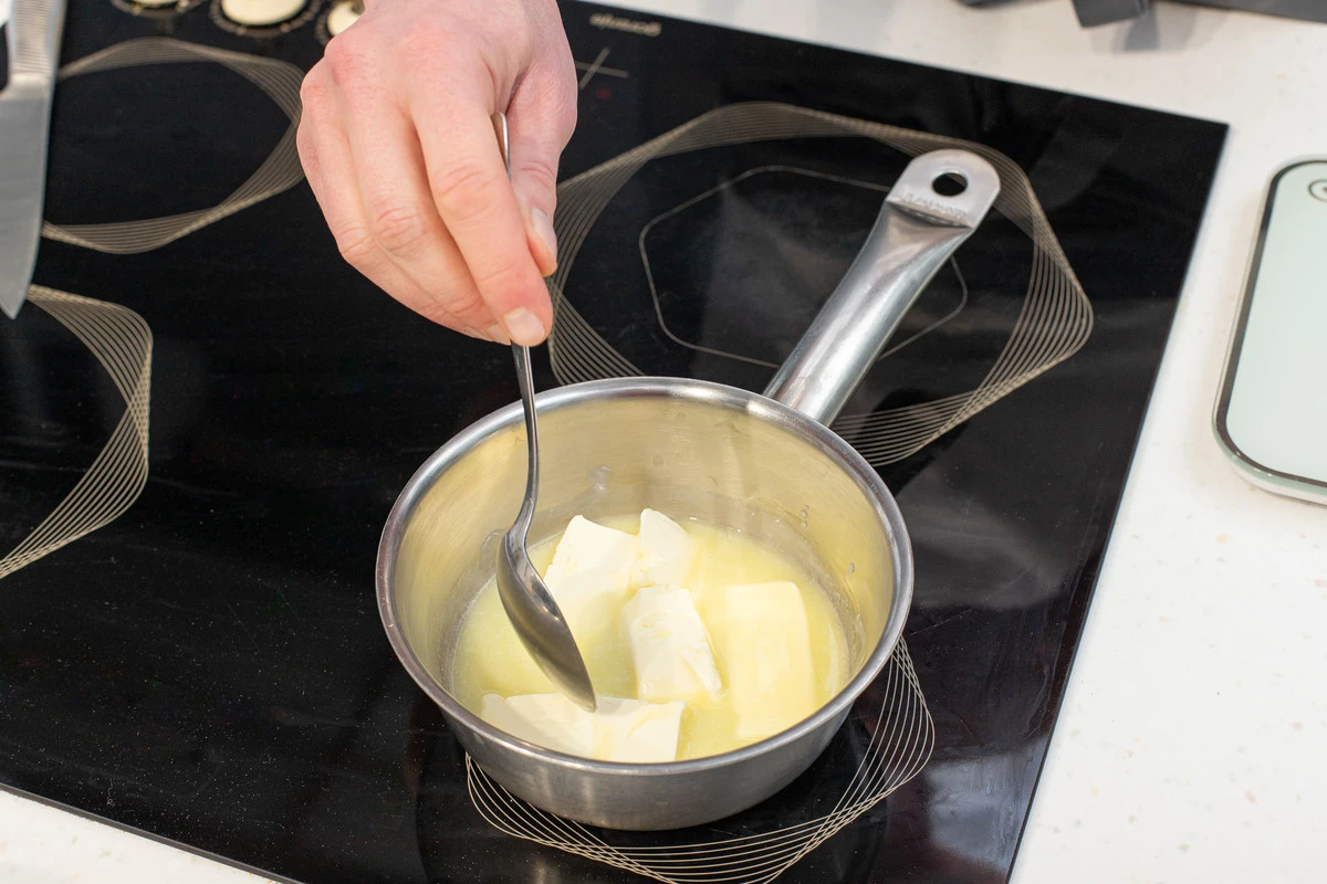 Растопите в сотейнике сливочное масло и доведите его до кипения, прокипятите до тех пор, пока оно не станет коричневого цвета. Это займёт около 3-4 минут.