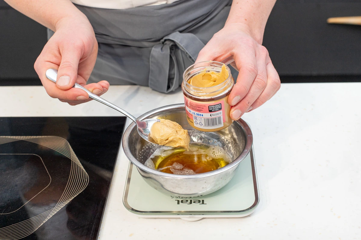 В горячее сливочное масло введите арахисовую пасту, размешайте венчиком до однородности.