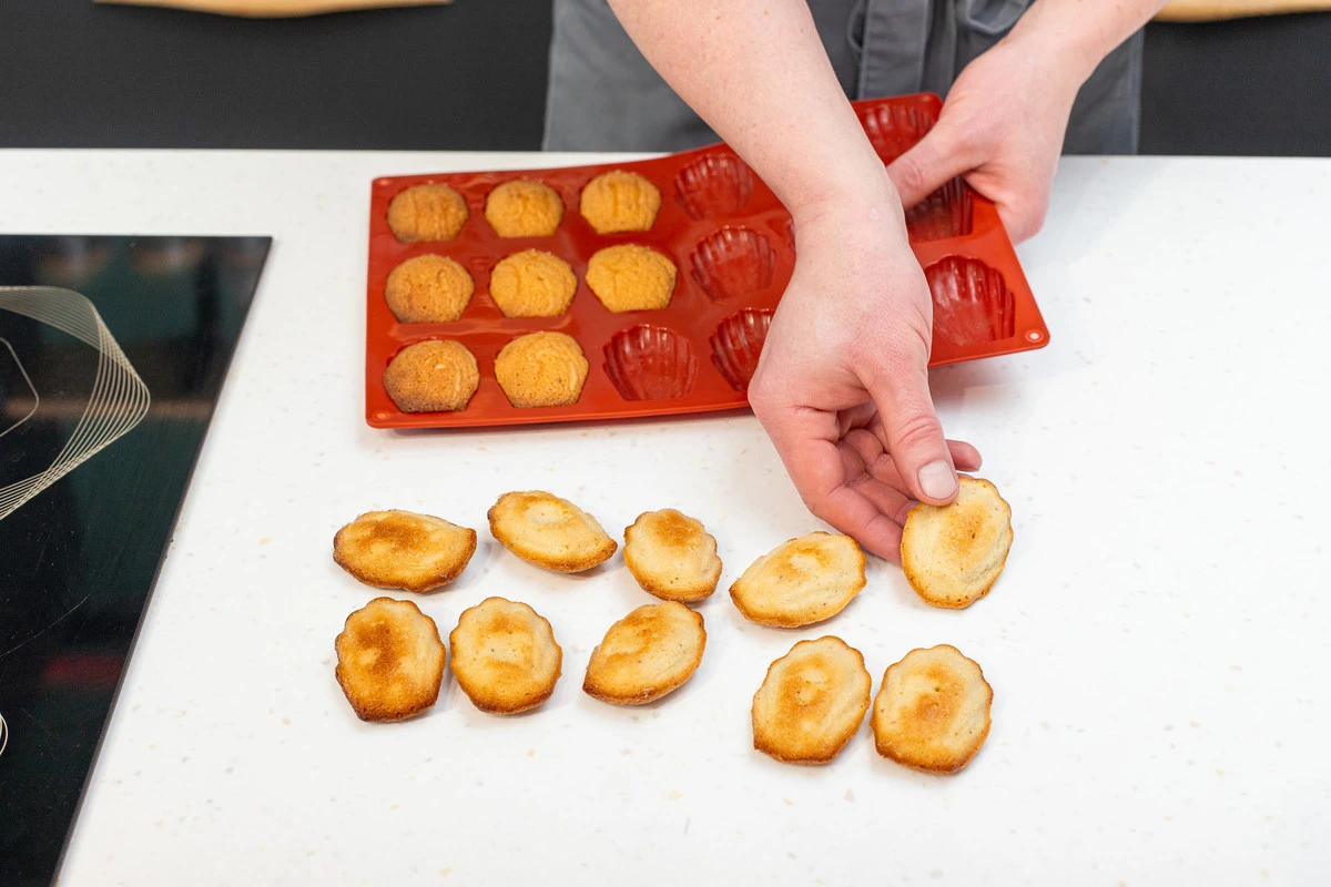 Готовые мадленки выньте из формы покройте затемперированным шоколадом. Для этого 100 г шоколада растопите на водяной бане или короткими импульсами по 10-15 секунд в микроволновке. Добавьте оставшиеся 50 г и активно перемешивайте массу силиконовой лопаткой, пока весь шоколад не растает. Измерьте температуру шоколада с помощью игольчатого или лазерного термометра: должно быть 32-33°C.