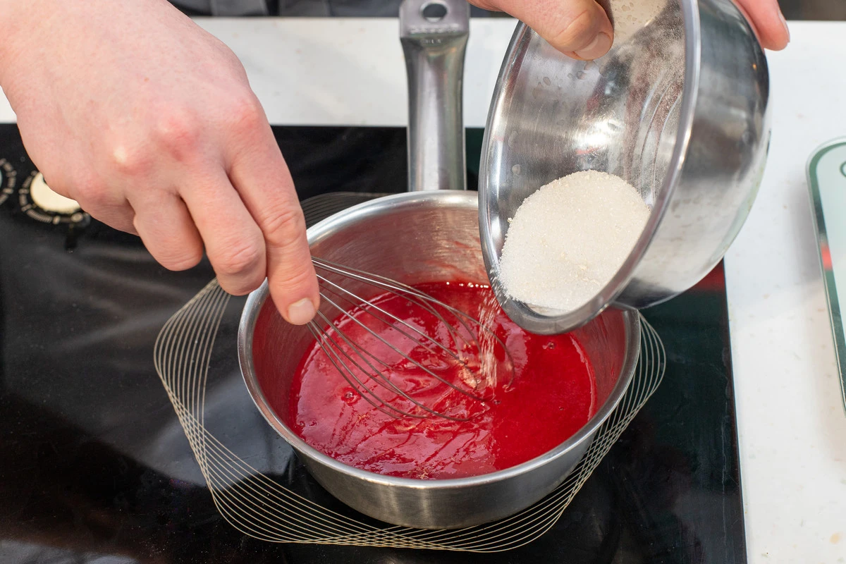 Для желе соедините пектин и сахар отдельно, нагрейте пюре до пара, всыпьте пектин с сахаром и, размешивая венчиком, доведите желе до кипения, прокипятите минуту и снимите с огня. Добавьте сок лимона и перемешайте.