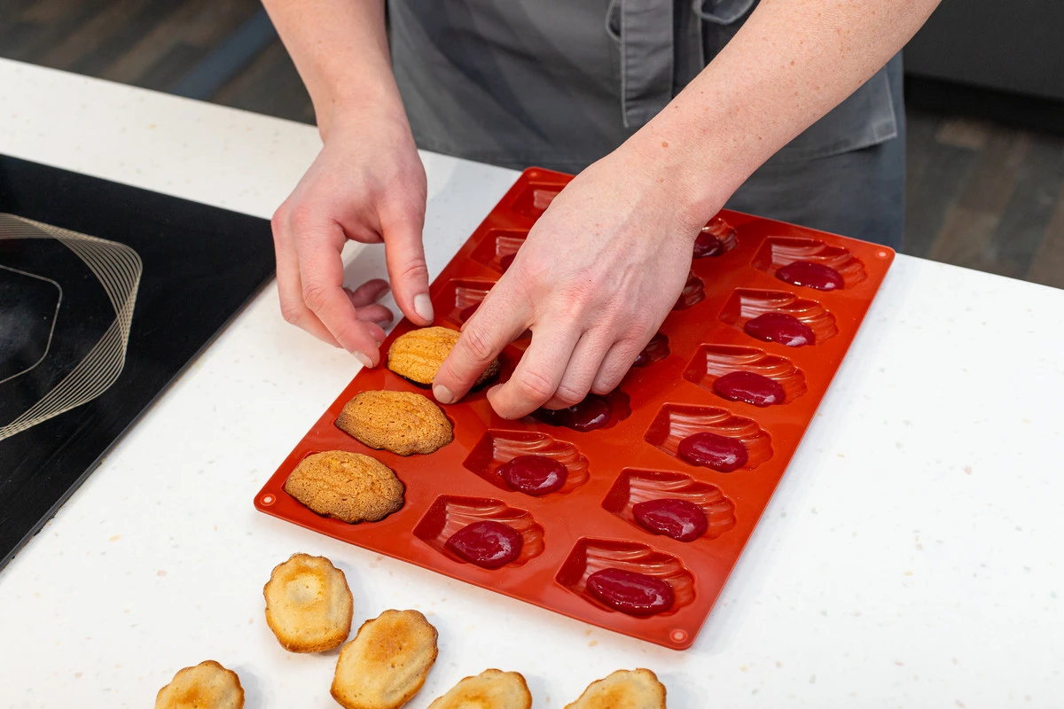 Налейте по 1 ст. л. желе в формы, сверху положите мадленки, придавите и уберите форму морозилку на 1 час.