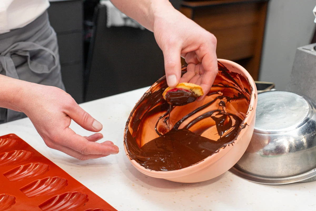 Окуните каждую мадленку в шоколад и уберите в морозилку на 15 минут. Готовое печенье можно хранить в закрытом контейнере до 7 дней в холодильнике и до трёх месяцев в морозилке.