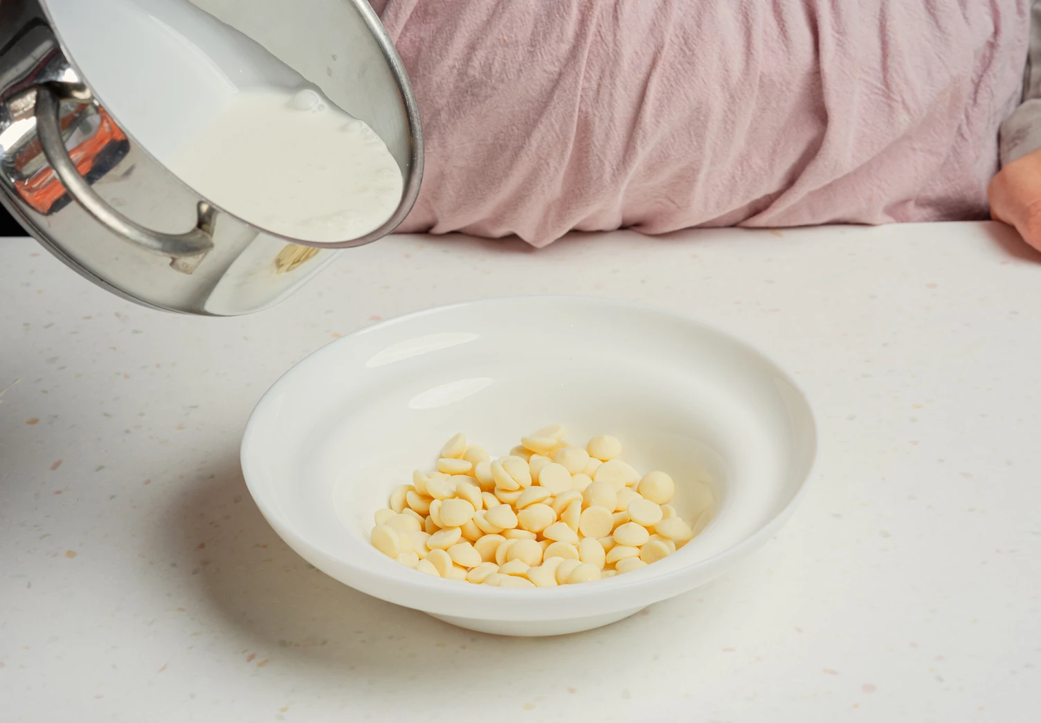 230 мл сливок доведите до кипения, снимите с огня, вмешайте разбухший желатин и залейте этой горячей смесью шоколад в каплях. Пробейте массу погружным блендером до гладкой однородной текстуры.