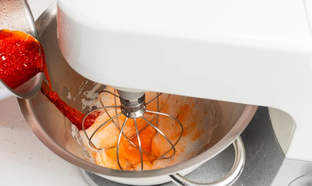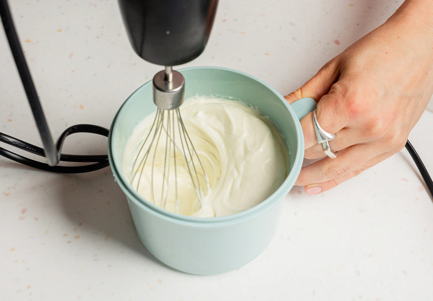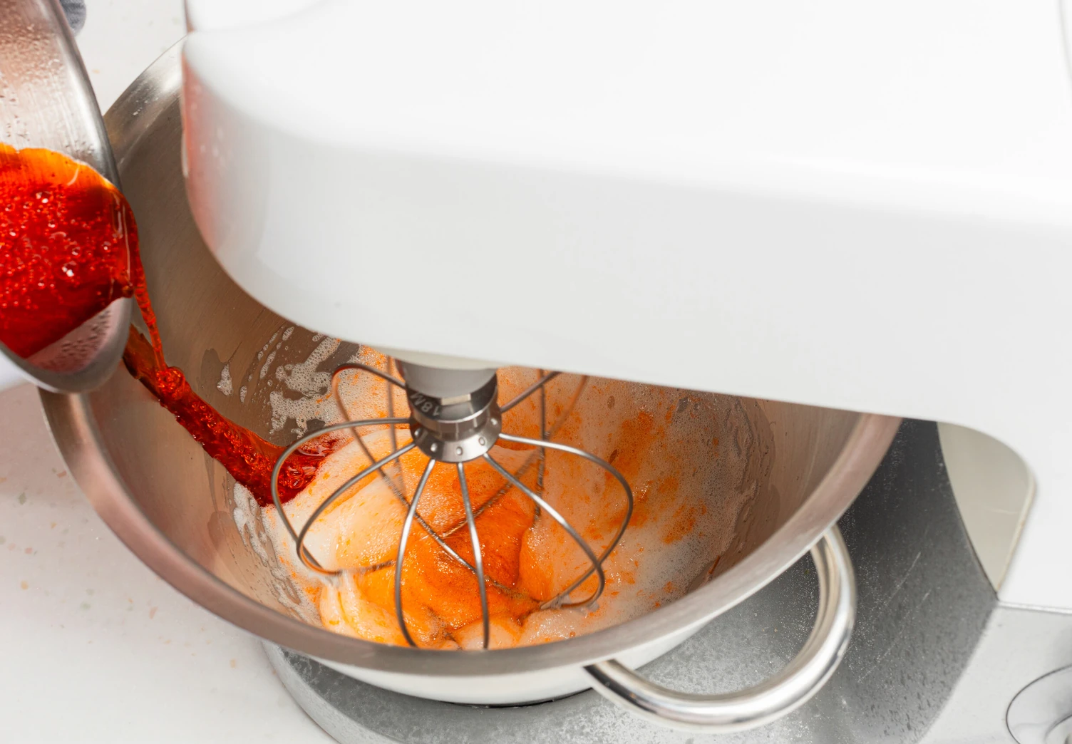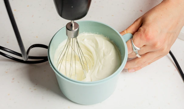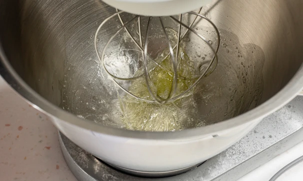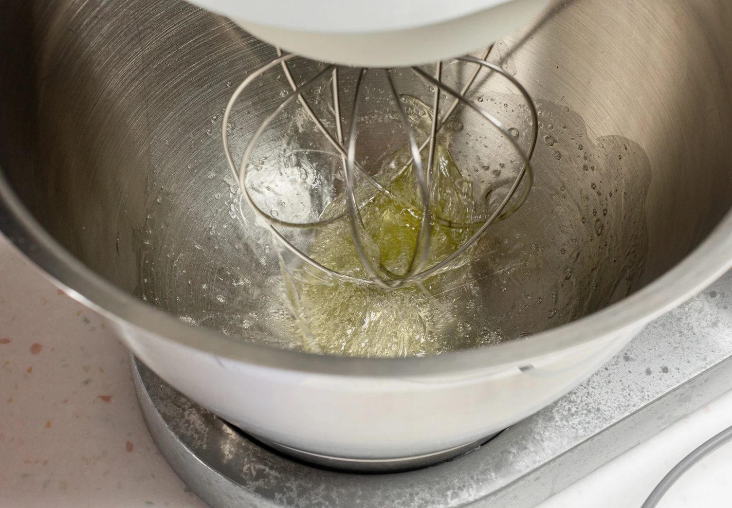 Пока нагревается сироп, начните взбивать на средней скорости миксера оставшиеся 55 г белка.