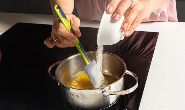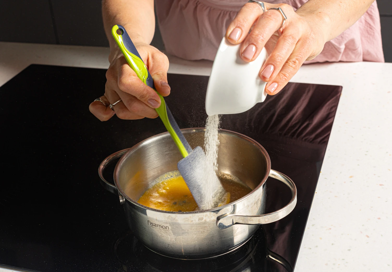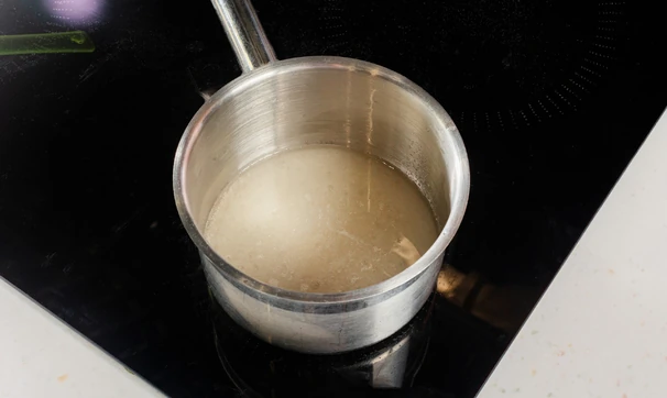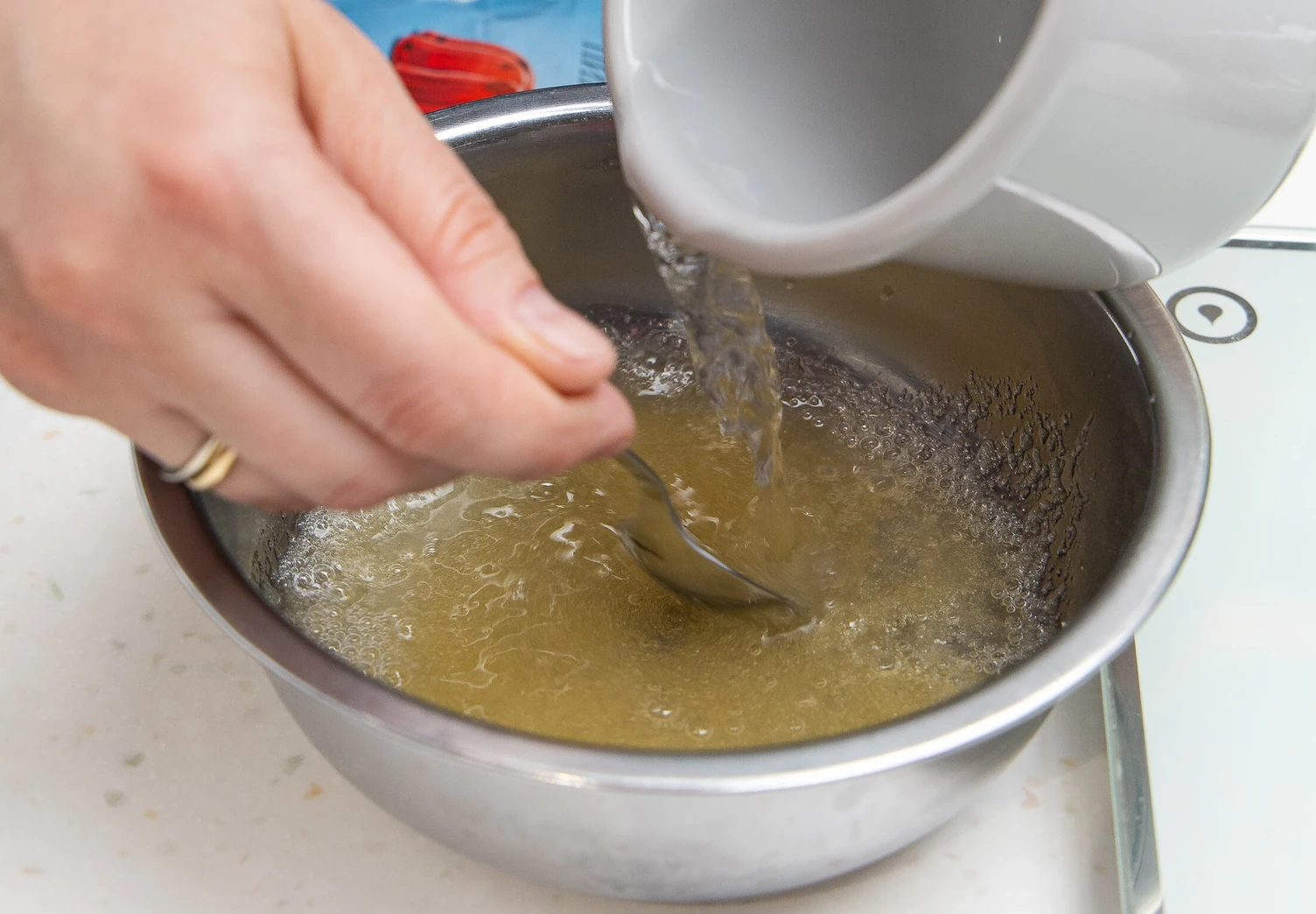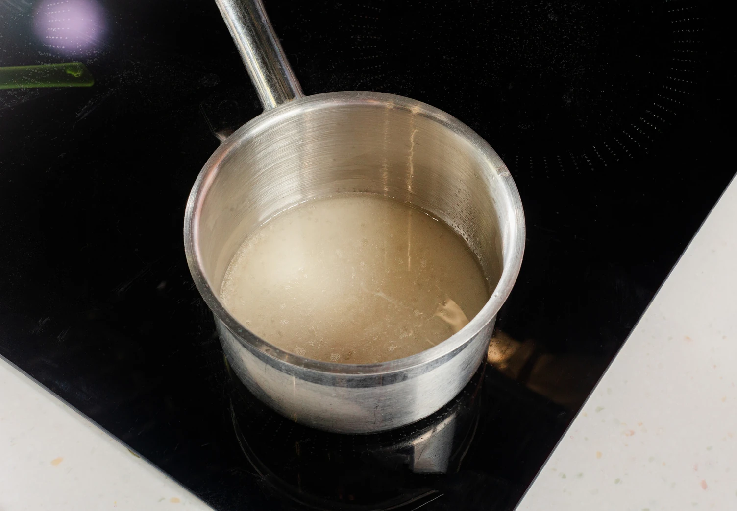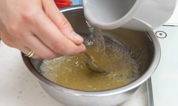 Смешайте воду и сахар и нагревайте, пока температура массы не достигнет 118 °C. Если используете краситель, добавьте несколько капель в готовый сироп.