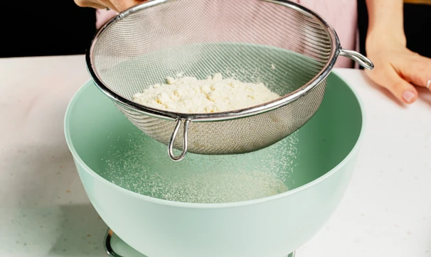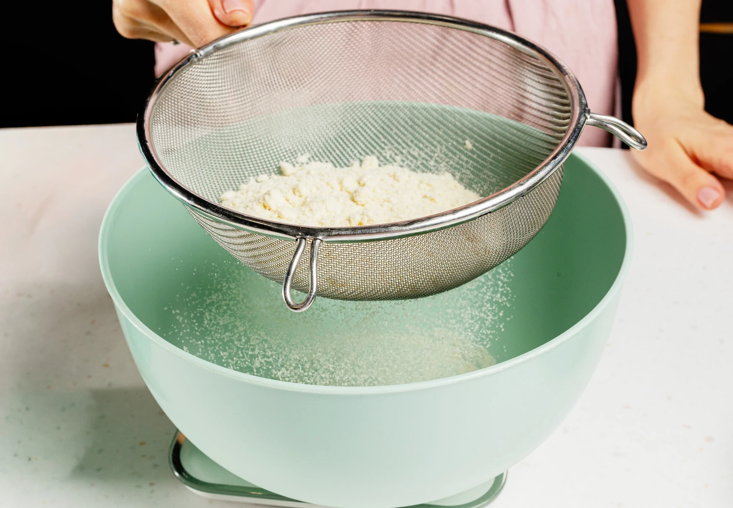 Для макаронс просейте миндальную муку и сахарную пудру в большую миску.