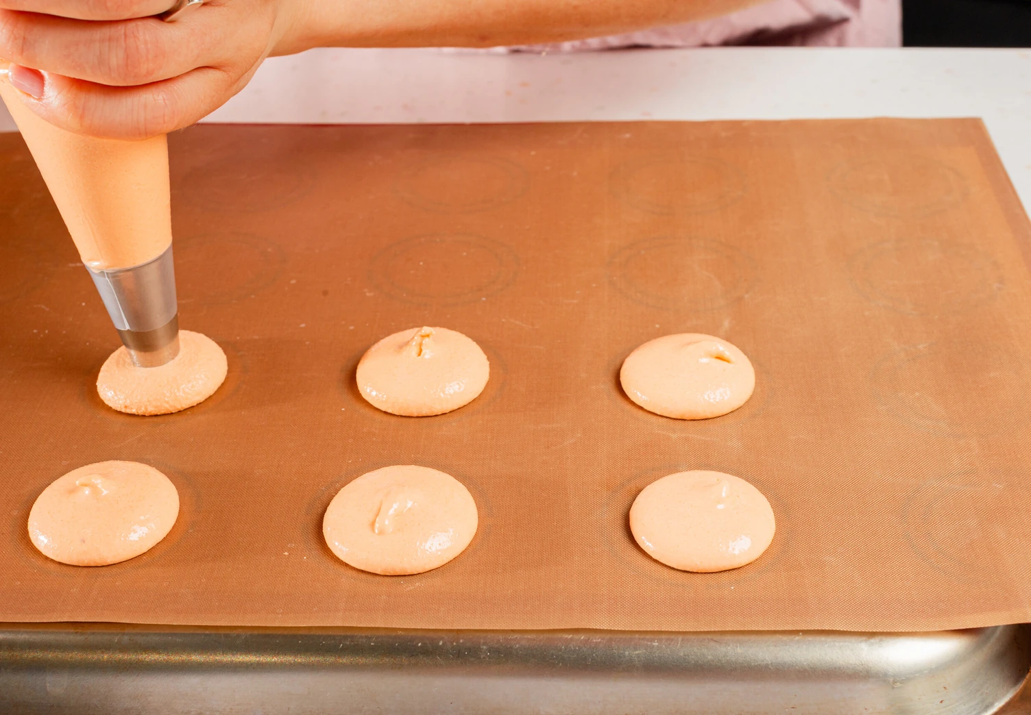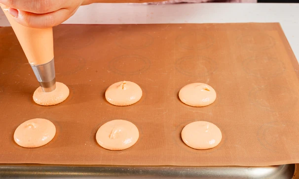 Застелите противень силиконовым или тефлоновым ковриком и отсадите на него кружочки диаметром 5–6 см на расстоянии 2–3 см друг от друга. Аккуратно, но уверенно стукните пару раз противень об стол, чтобы убрать из теста лишний воздух. Если на поверхности макаронс всё ещё остались пузырьки, проколите их с помощью зубочистки.