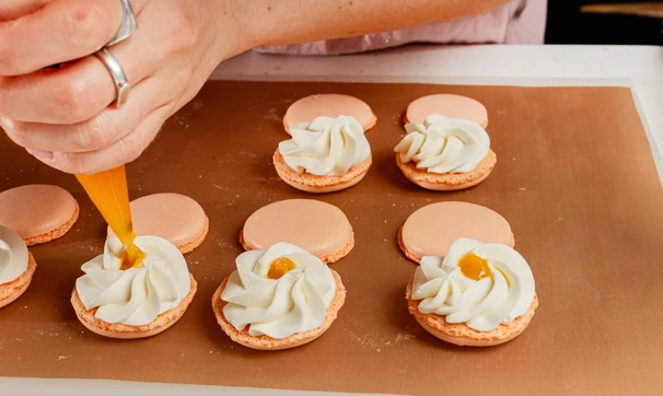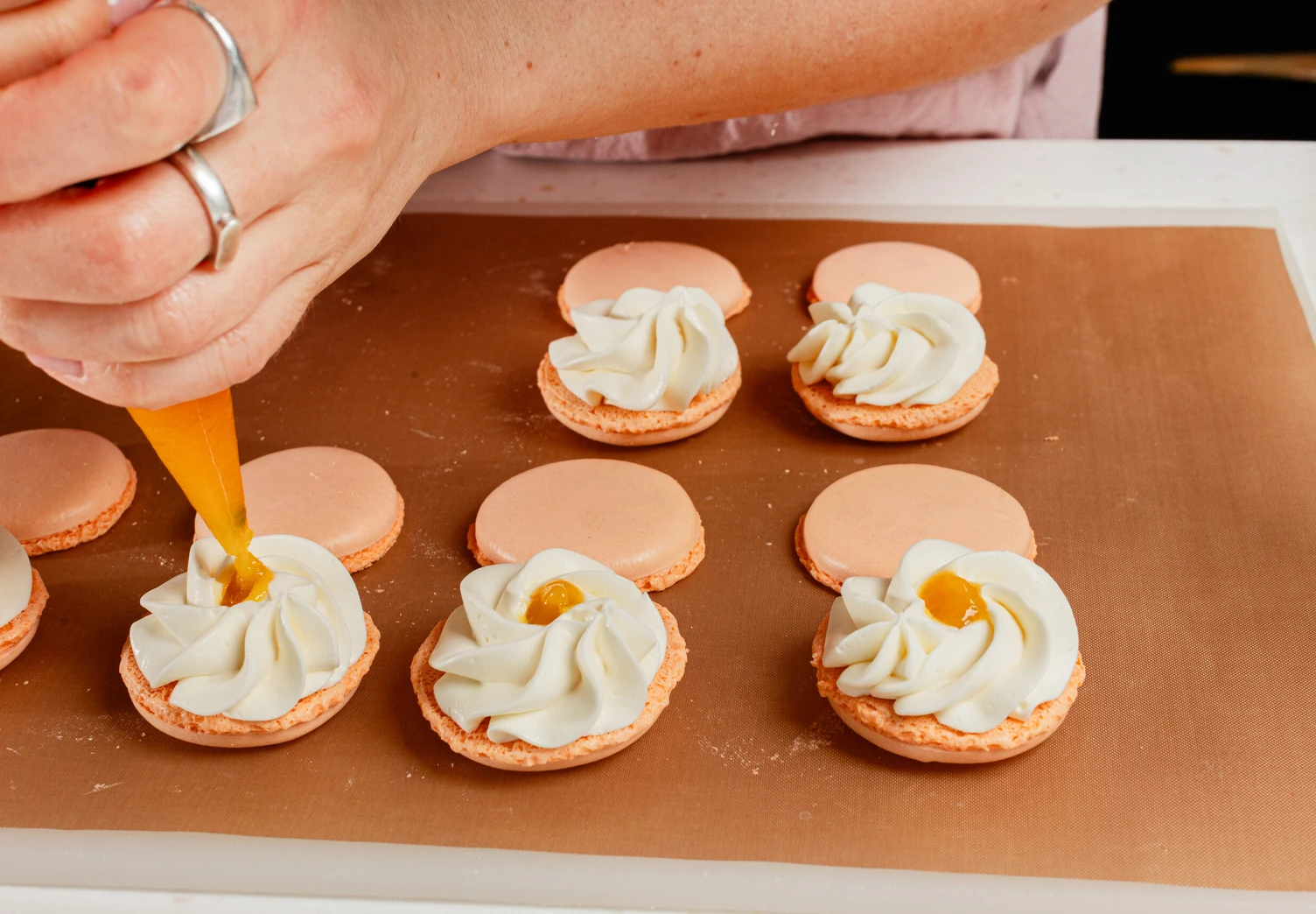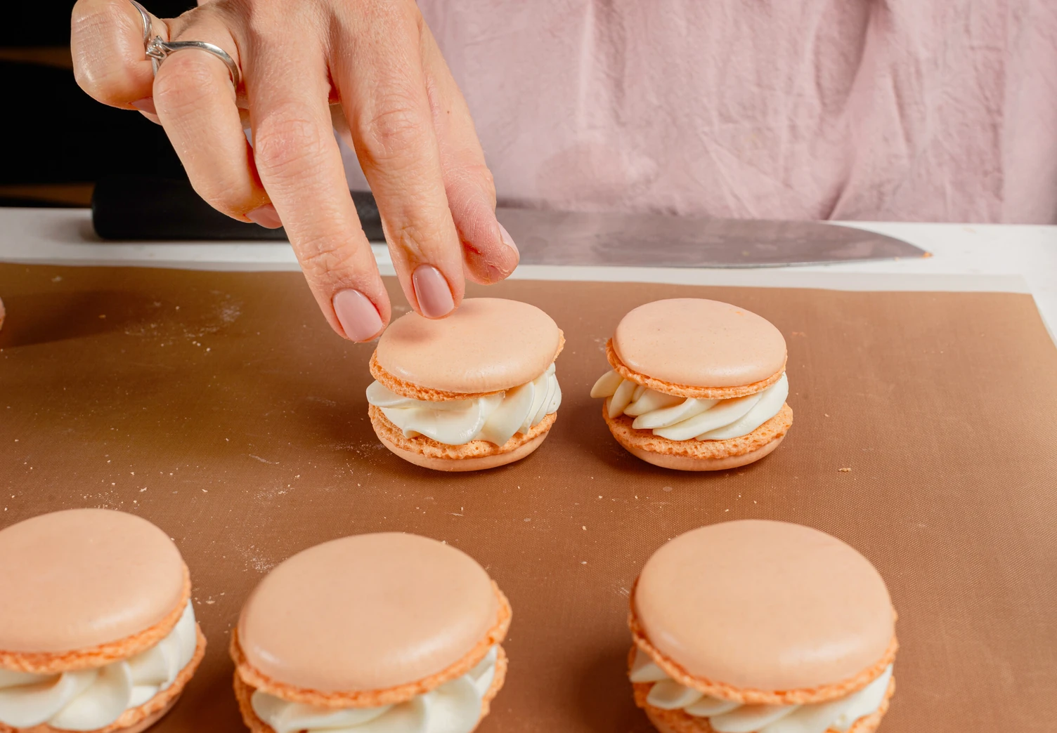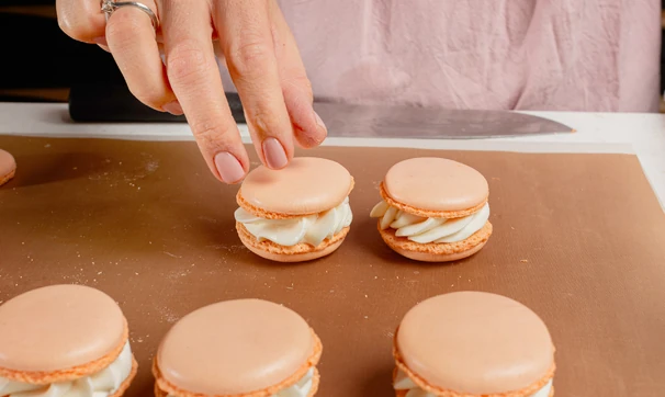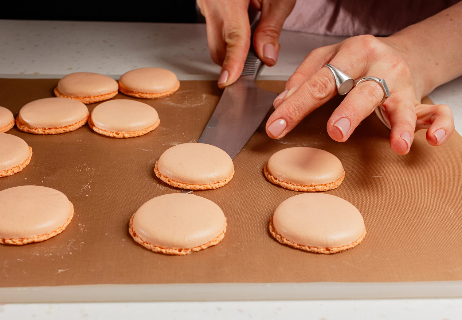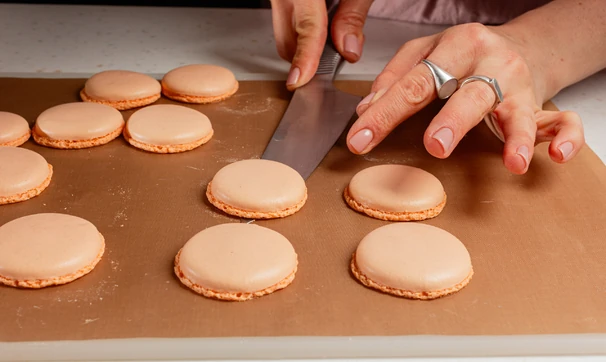 Разогрейте духовку в режиме верхней и нижней конвекции до 155 °C. Отправьте туда противни с макаронс и сразу убавьте температуру до 130 °C. Выпекайте около 14 минут. Готовые макаронс должны легко сниматься с коврика, не оставляя следов, но при этом не быть пересушенными.