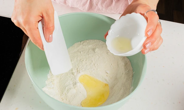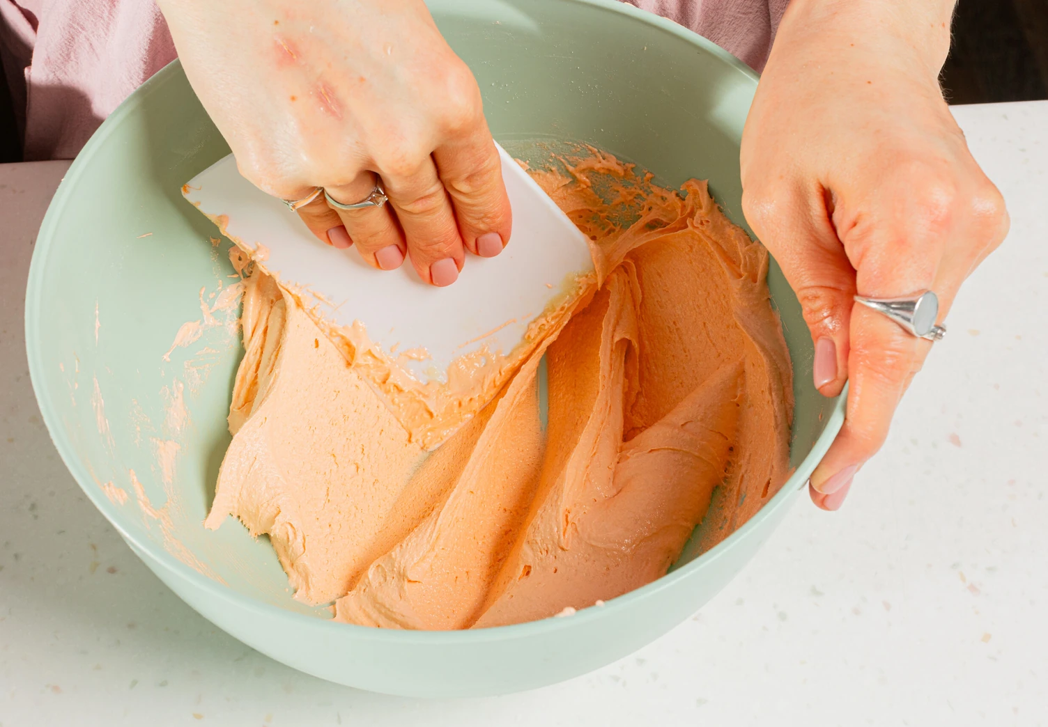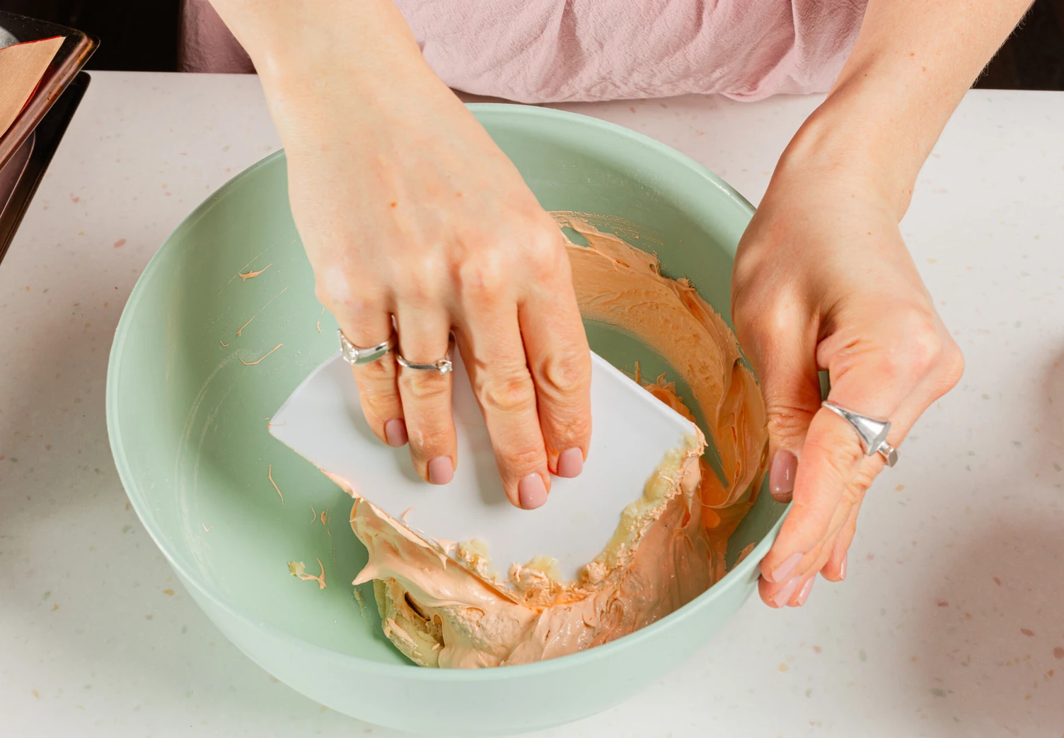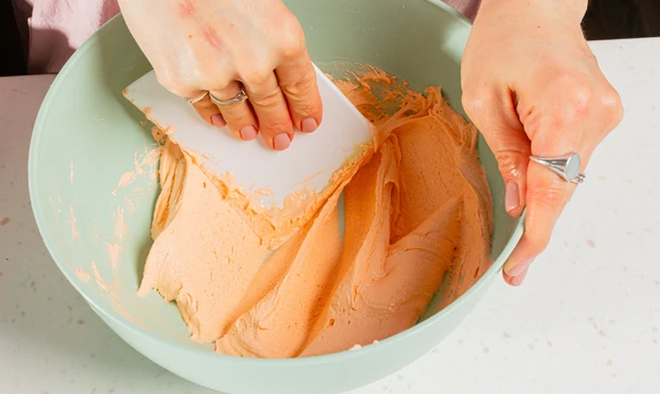Затем добавьте оставшуюся меренгу и тщательно перемешайте массу до состояния гладкой однородной пасты. Выложите полученное тесто в кондитерский мешок с круглой насадкой.