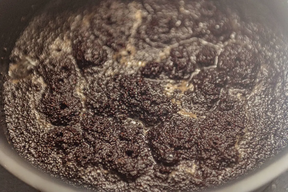 Мак залейте кипятком в сотейнике и оставьте на полчаса. Затем добавьте изюм, доведите до кипения и варите ещё полчаса, в конце добавьте мёд. При желании можно заменить мёд сахаром.