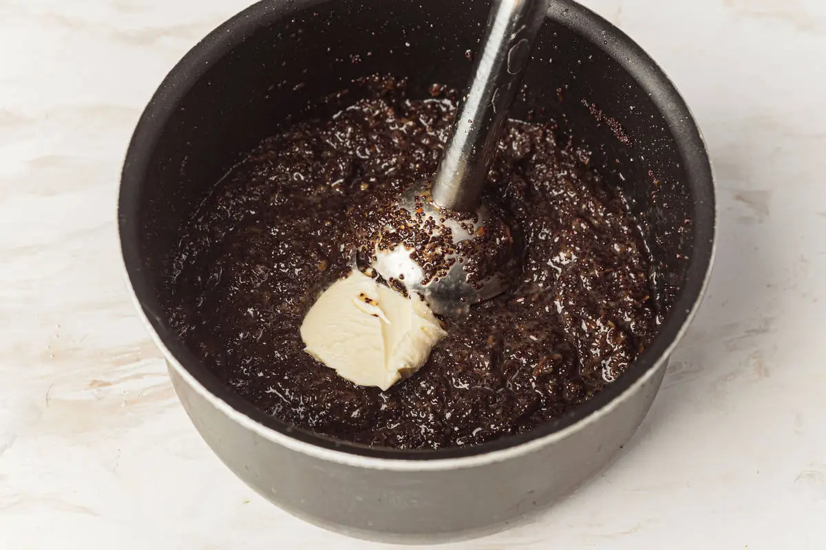 Пробейте мак и изюм блендером, добавив 100 г сливочного масла. Разогрейте духовку до 180 °С.