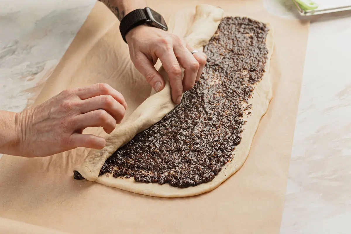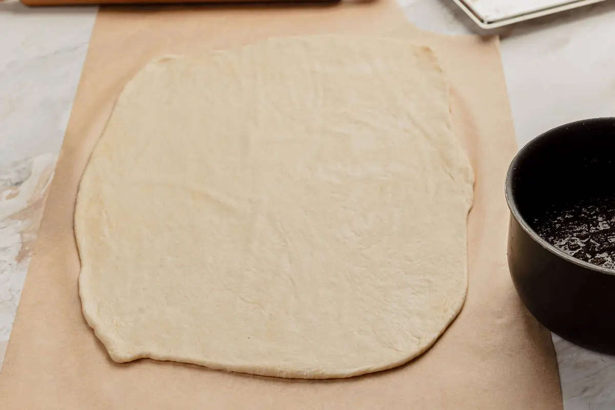 Тесто раскатайте в прямоугольный не слишком толстый пласт.