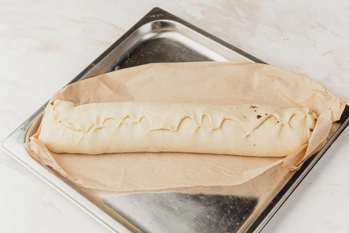 Выложите рулет на пергамент для выпечки и поставьте в горячую духовку, выпекайте около 25 минут до золотистости.
