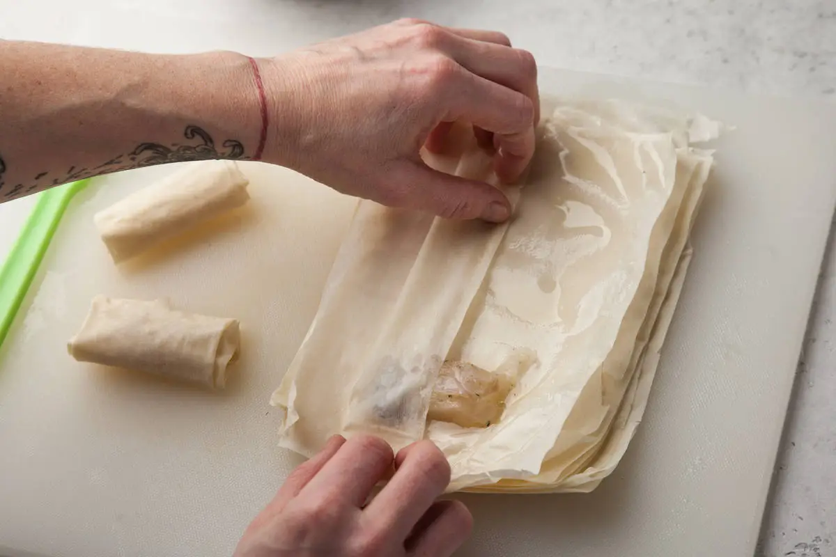 Разрежьте стопку листов фило на четыре прямоугольника. Первый лист смажьте маслом, положите кусочек рыбы и заверните конвертиком. Повторяйте, пока не завернете всю рыбу.