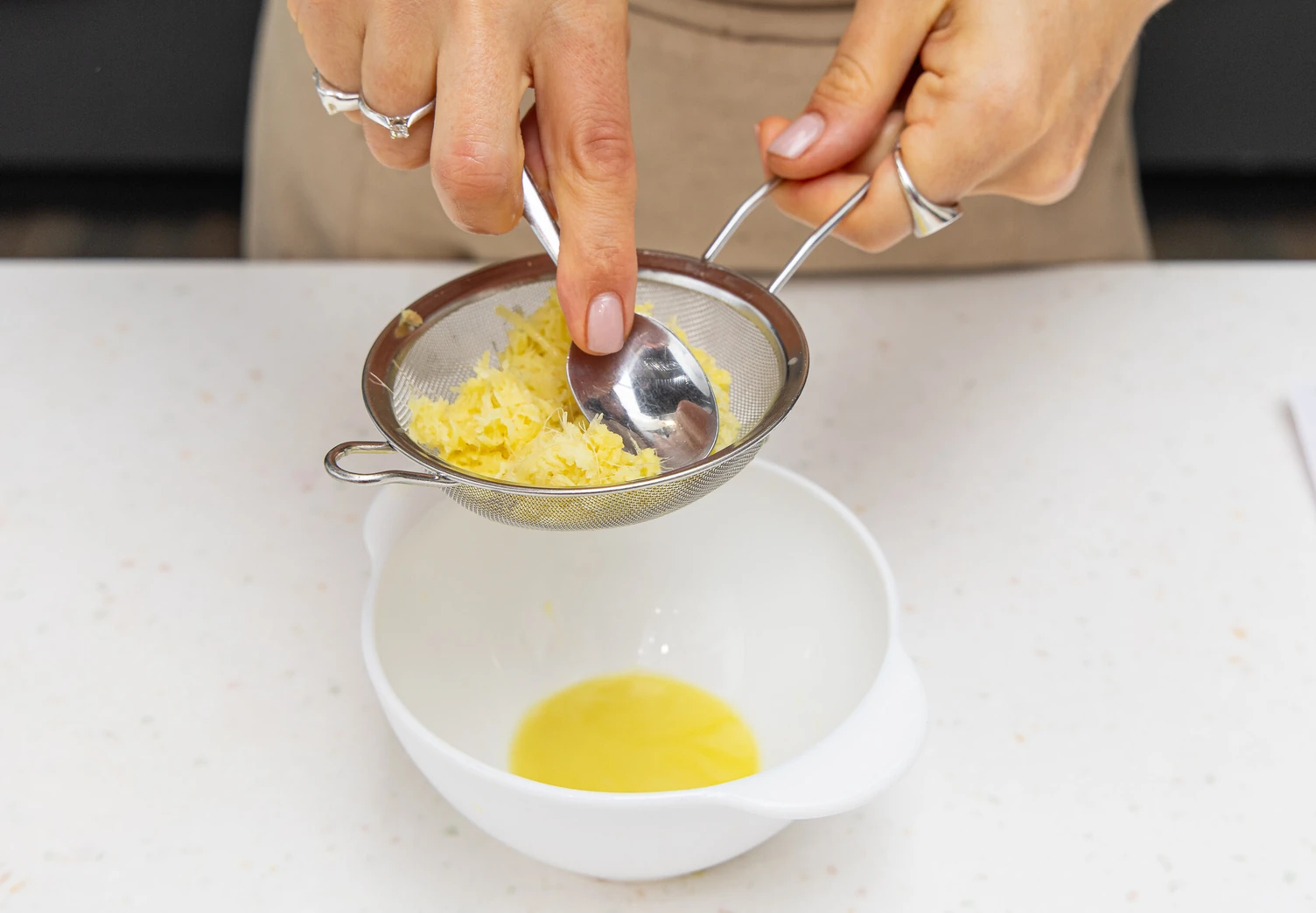 Натрите имбирь (понадобится 100–120 г свежего корня) на мелкой тёрке и отожмите как следует полученную массу. Мякоть выкиньте: нам понадобится только сок.