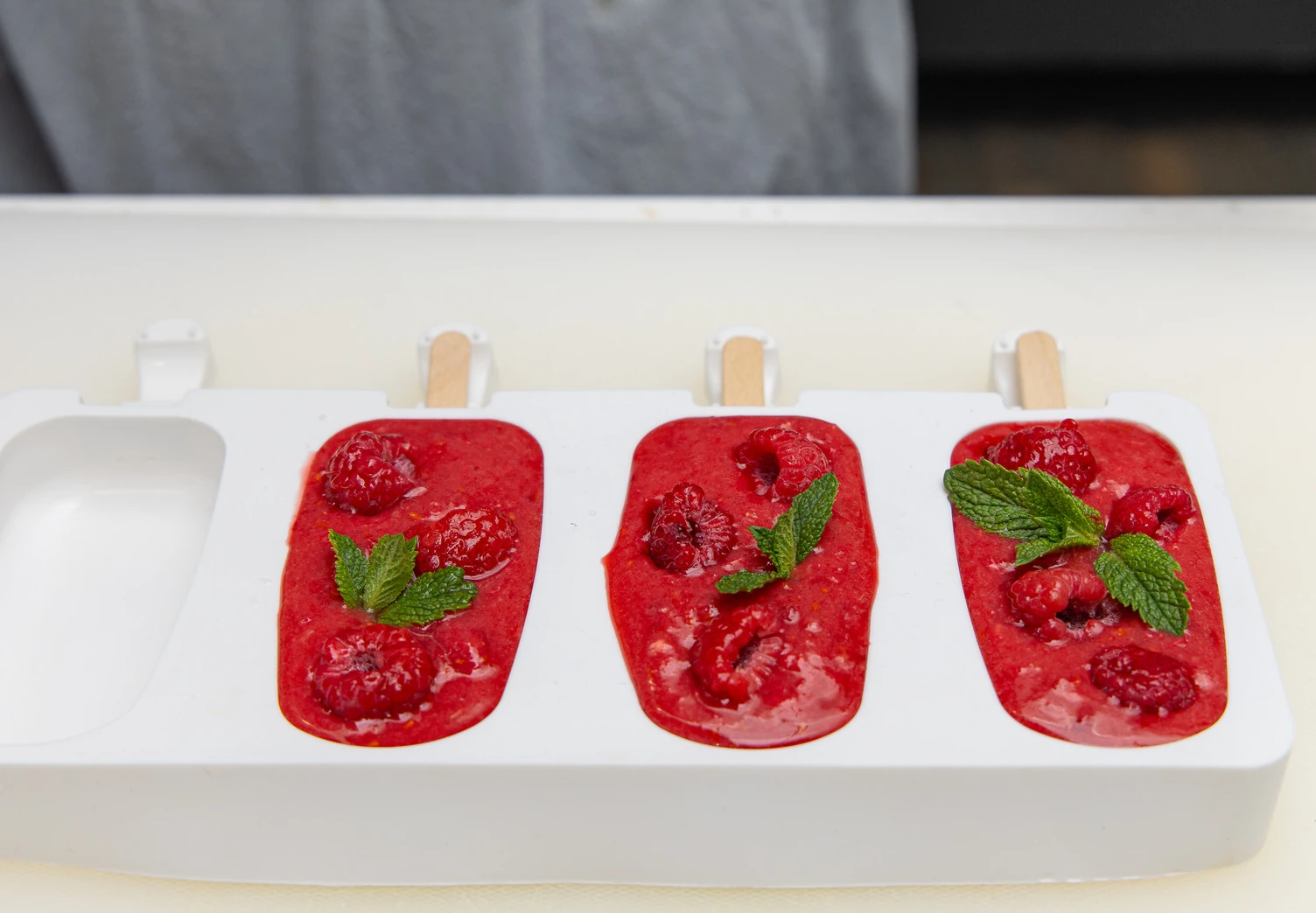 Добавьте в каждую секцию по несколько ягод малины и листиков свежей мяты.