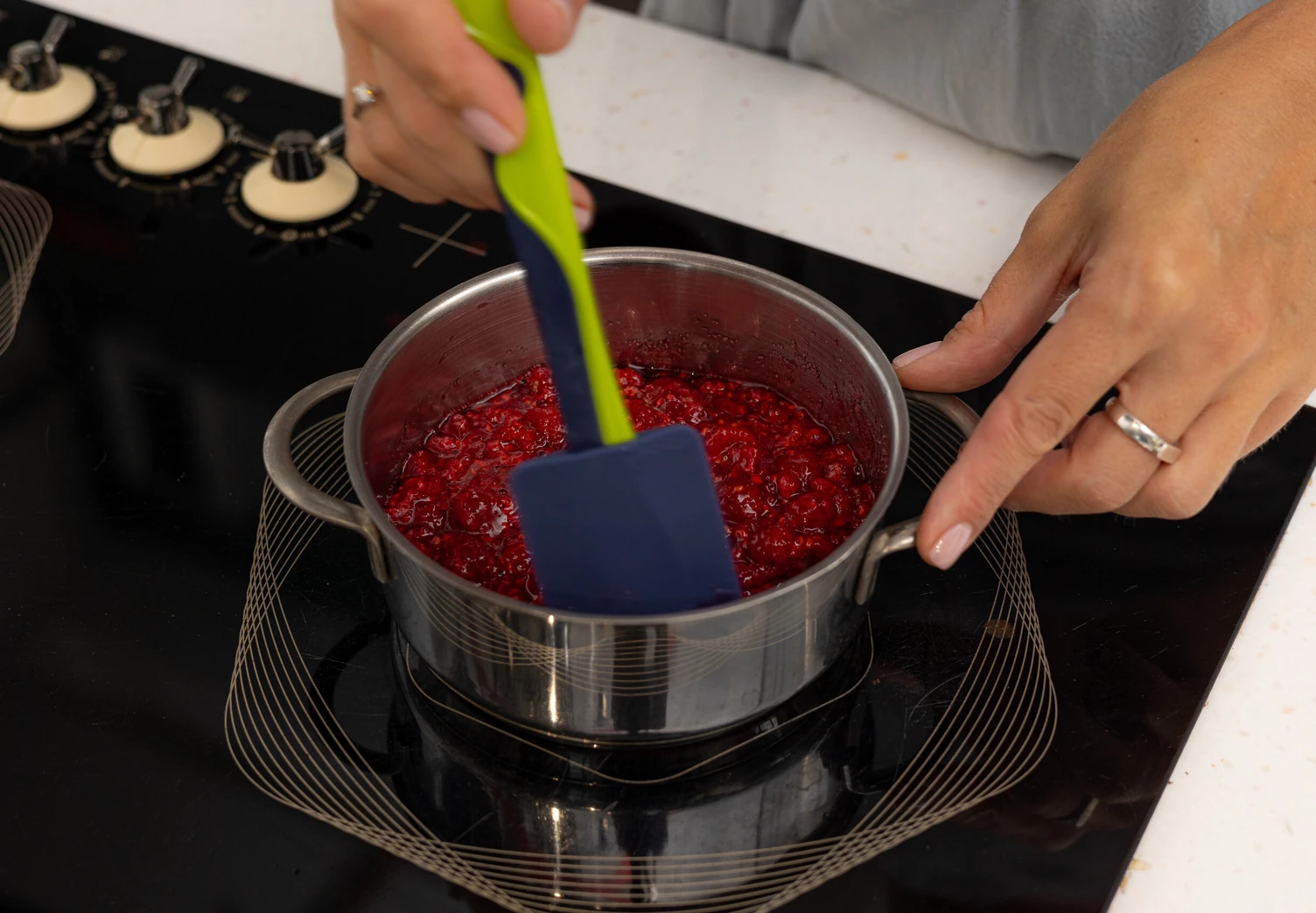 Приготовьте малиновую начинку. 150 г ягод смешайте в сотейнике с сахаром и доведите до кипения.