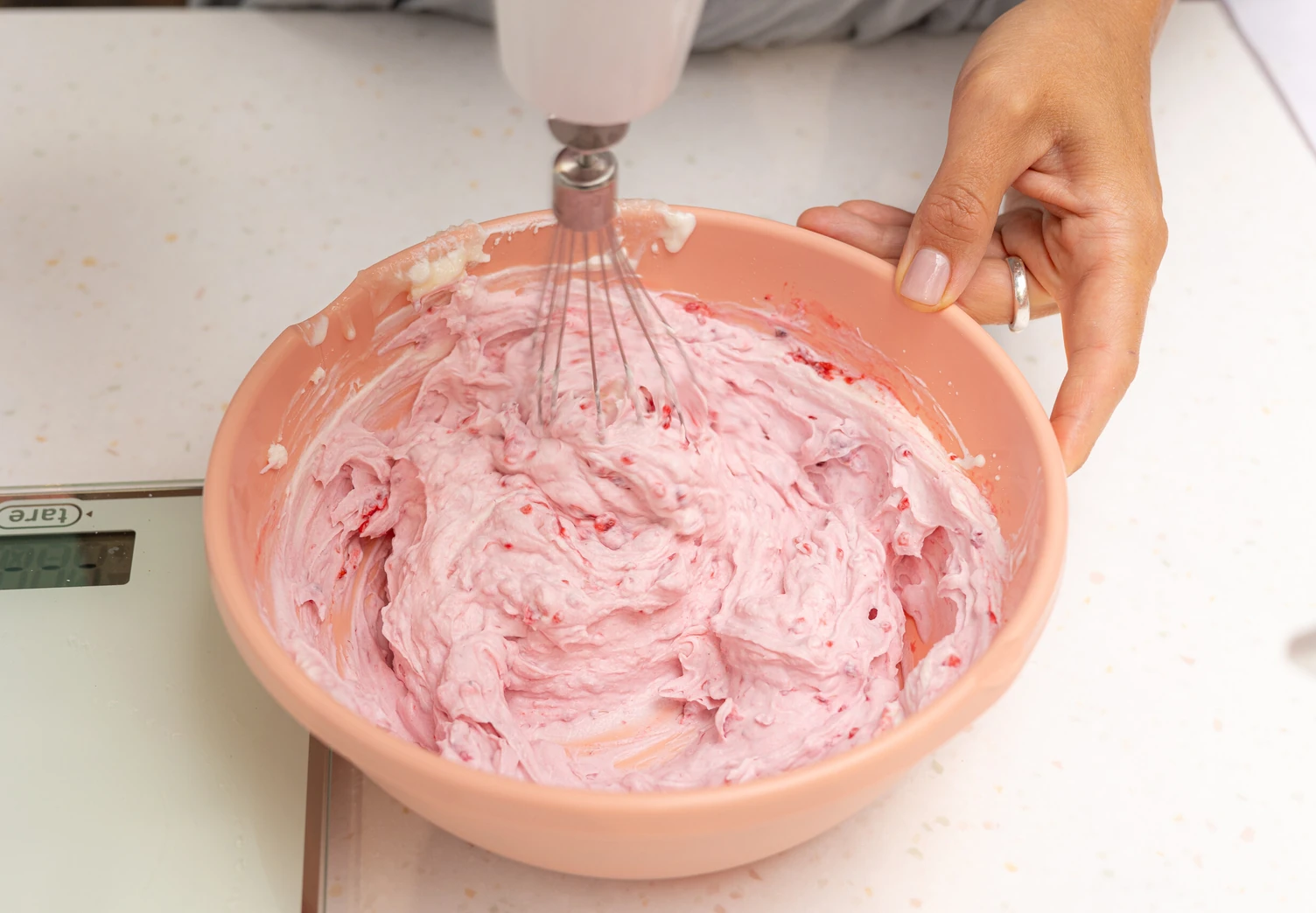Для крема творожный сыр взбейте миксером с холодными сливками и сахарной пудрой. В конце подмешайте оставшиеся 50 г малины и снова взбейте. Готовый крем переложите в кондитерский мешок.
