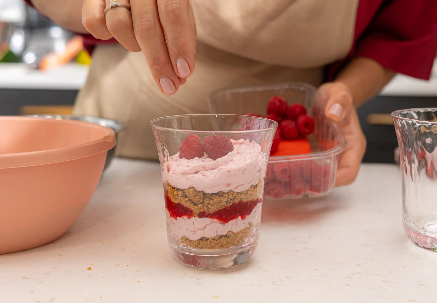 Соберите трайфлы в следующей последовательности: печенье, крем, малиновая начинка, печенье, крем. Украсьте свежими ягодами.