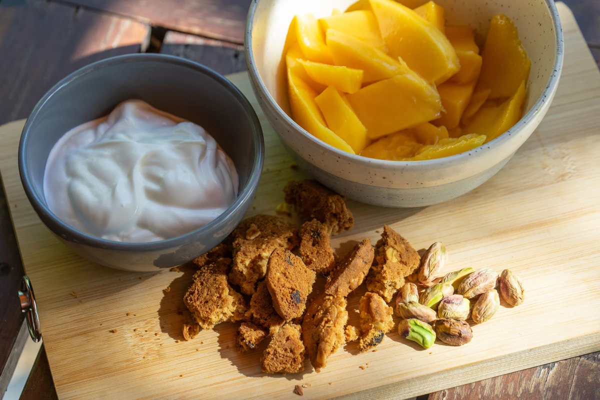 Очистите манго. Четверть мякоти нарежьте кубиками для украшения, остальную часть нарежьте произвольно крупно. Печенье поломайте на мелкие кусочки или порубите ножом. Фисташки также измельчите ножом.