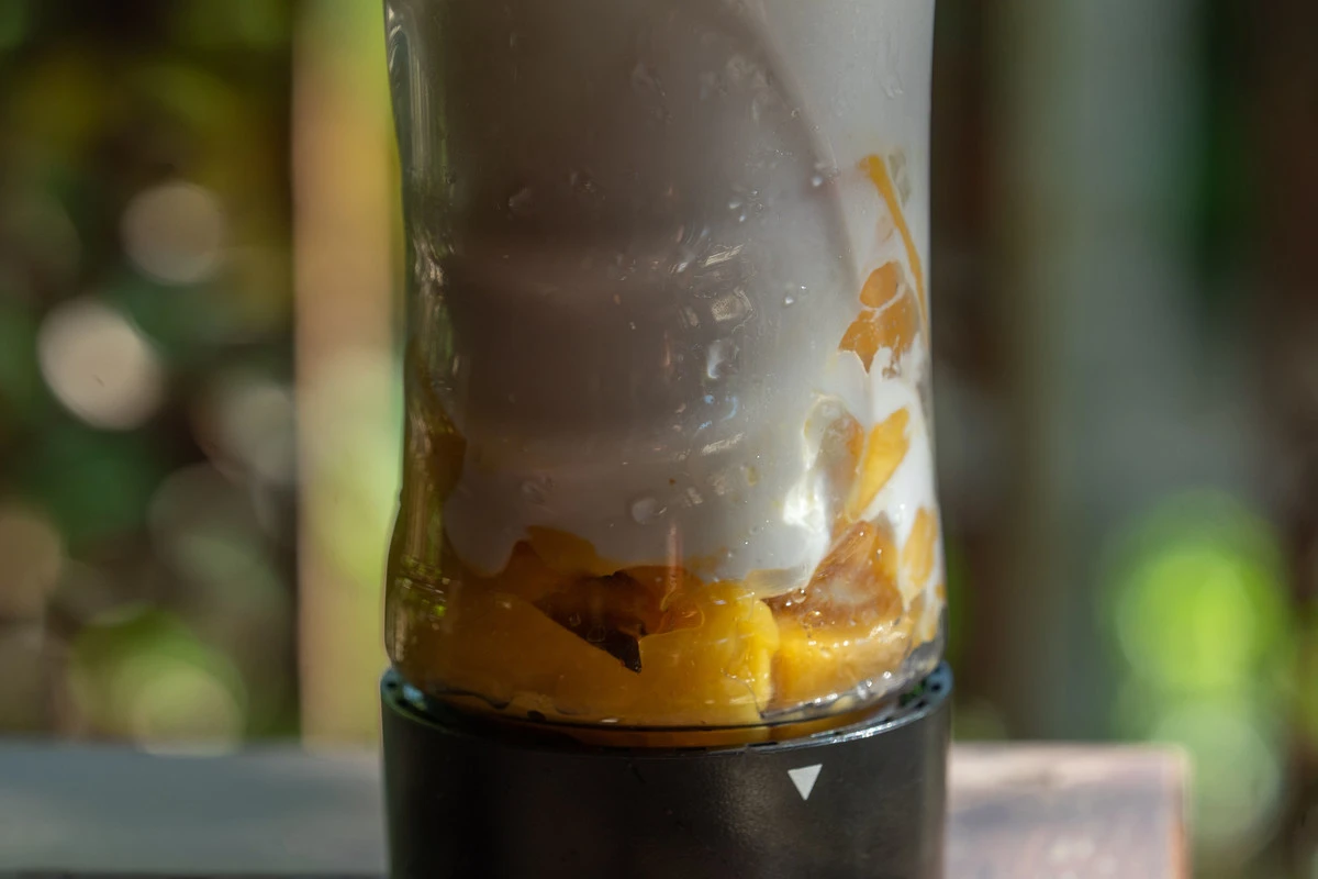 Пробейте в блендере манго и йогурт в течение нескольких секунд, до получения однородной массы.