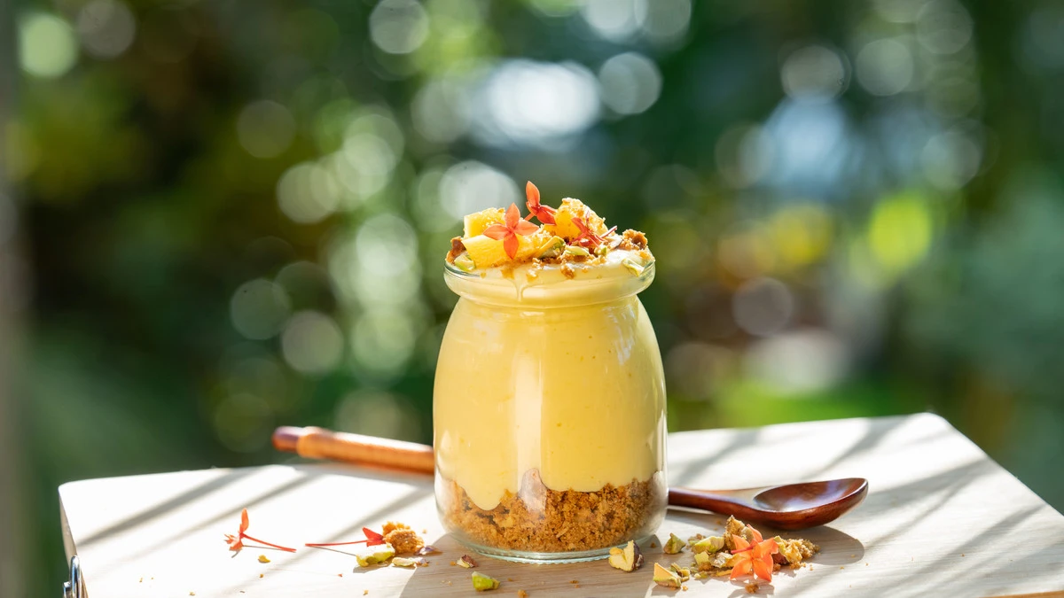 Посыпьте ласси чизкейк фисташками, оставшейся крошкой печенья и кусочками манго.