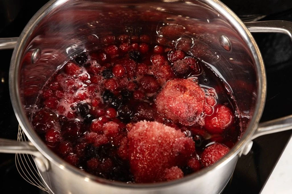 Ягоды выложите в сотейник, доведите до кипения, влейте воду с крахмалом, варите, помешивая 1–2 минуты до загустения.