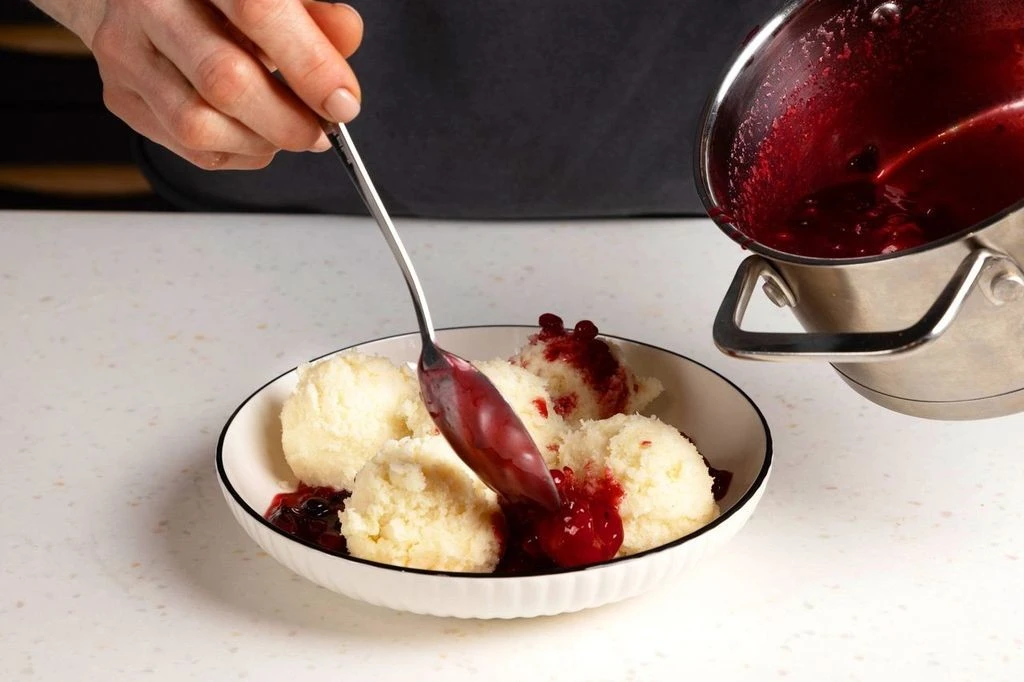 Остудите манку и ягодный соус. Из манки сформируйте шарики, выложите в тарелку и залейте ягодным соусом. Украсьте мятой и подавайте!