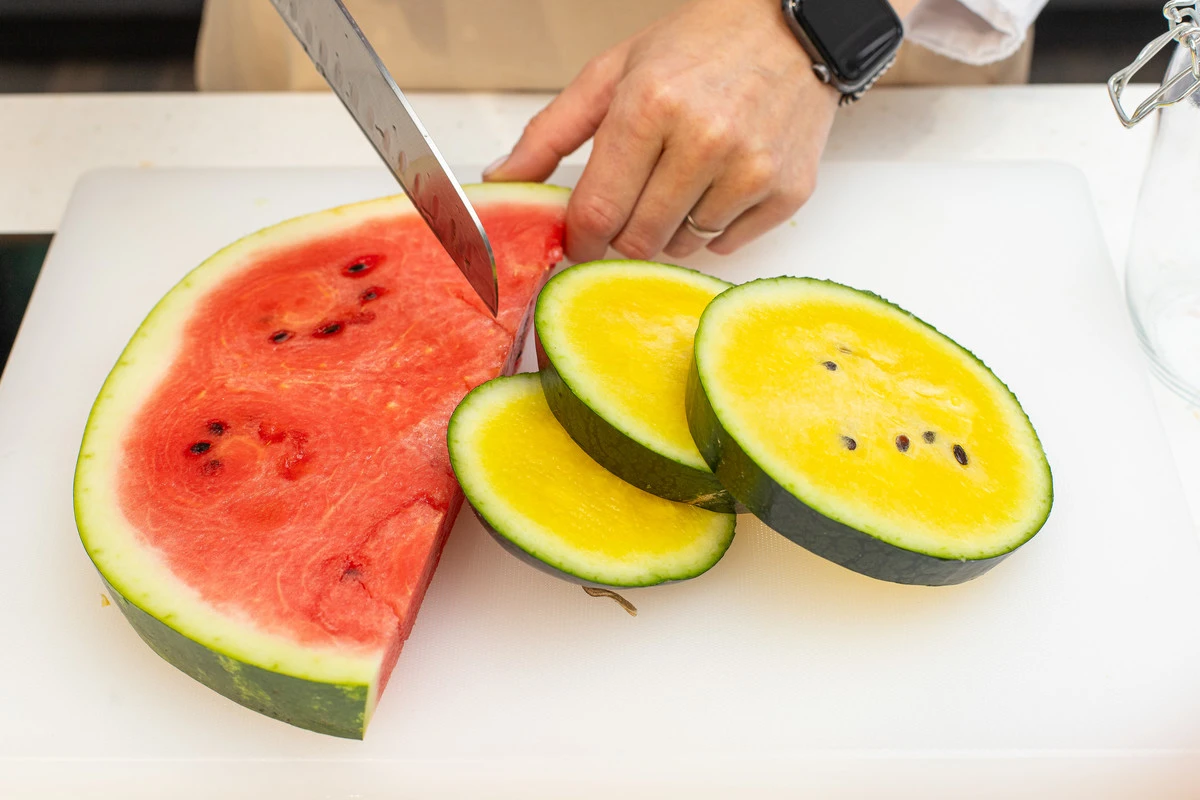 Банки обдайте кипятком. Арбуз помойте и нарежьте на небольшие треугольнички вместе с корками. Для этого рецепта вы можете использовать обычный красный арбуз или взять такой, в котором мало косточек — например, «Чёрный принц» или красный арбуз «Яйцо дракона».