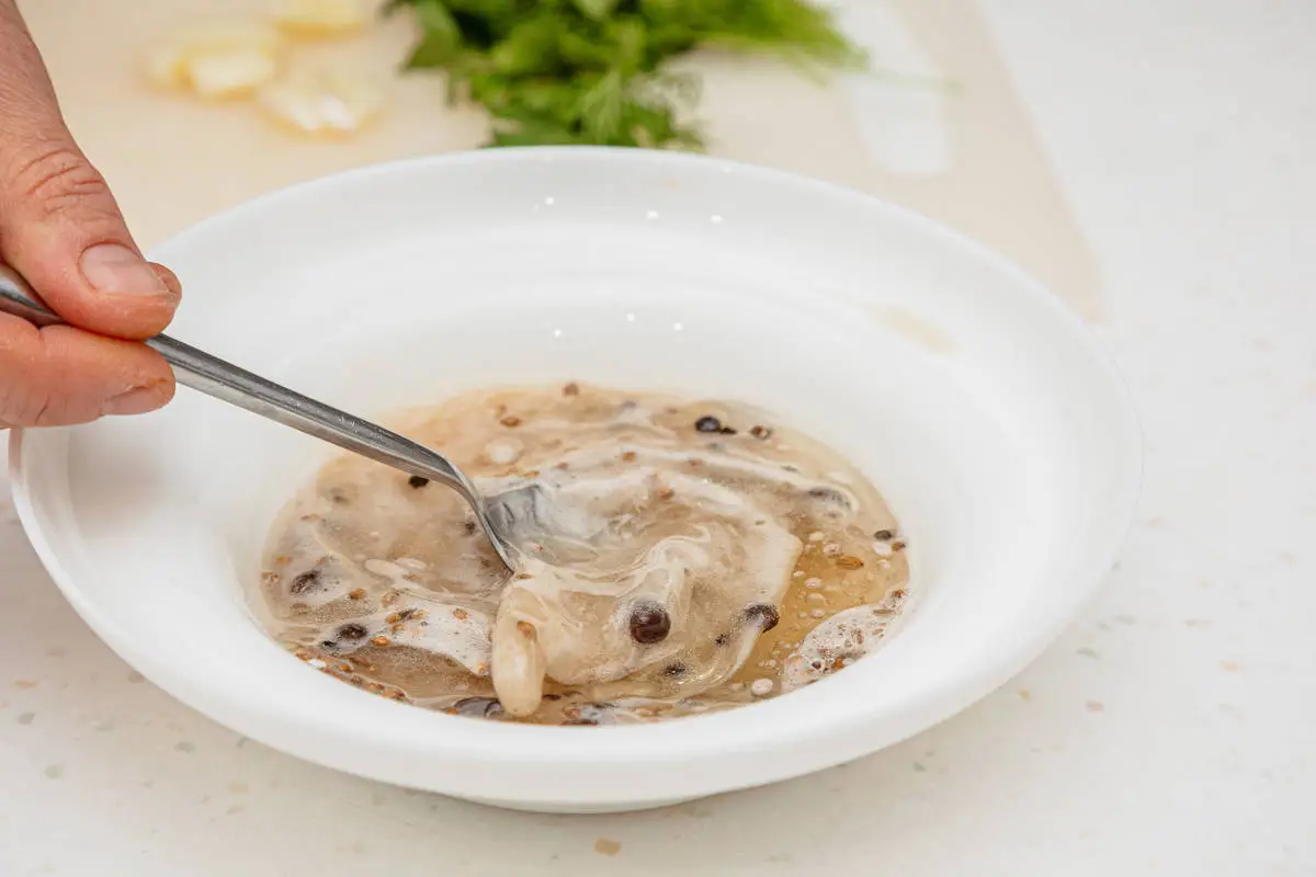 Смешайте в небольшой мисочке соль, сахар, воду, уксус и специи, добавьте раздавленный чеснок.
