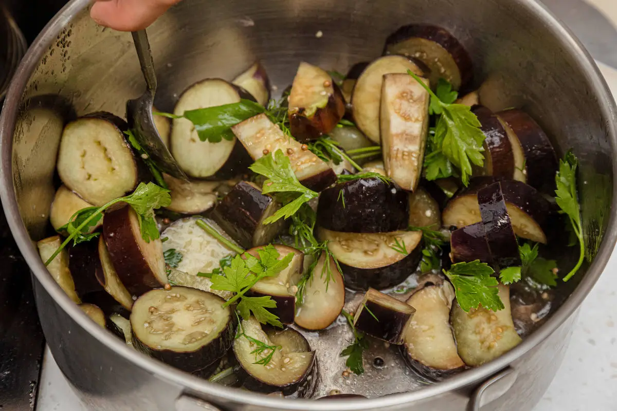 Баклажаны сложите в миску, кастрюлю или контейнер. Залейте маринадом, добавьте нарезанную зелень.