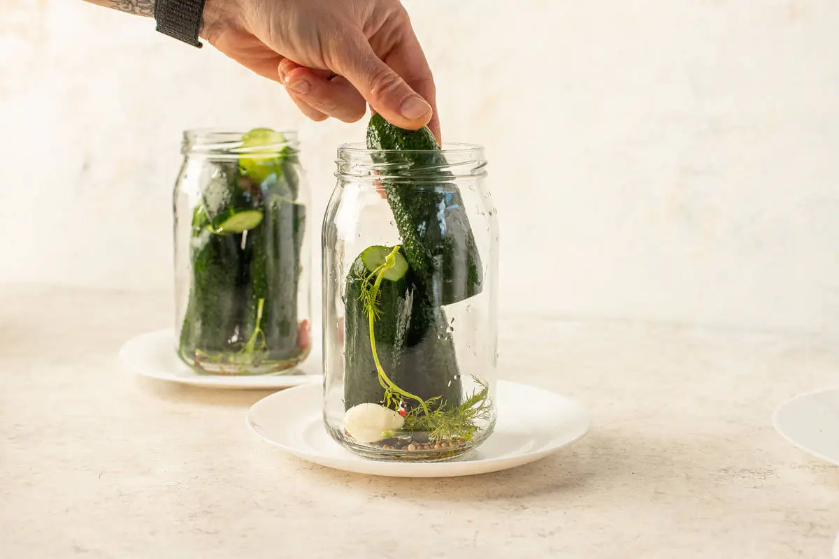 Плотно набейте огурцы.