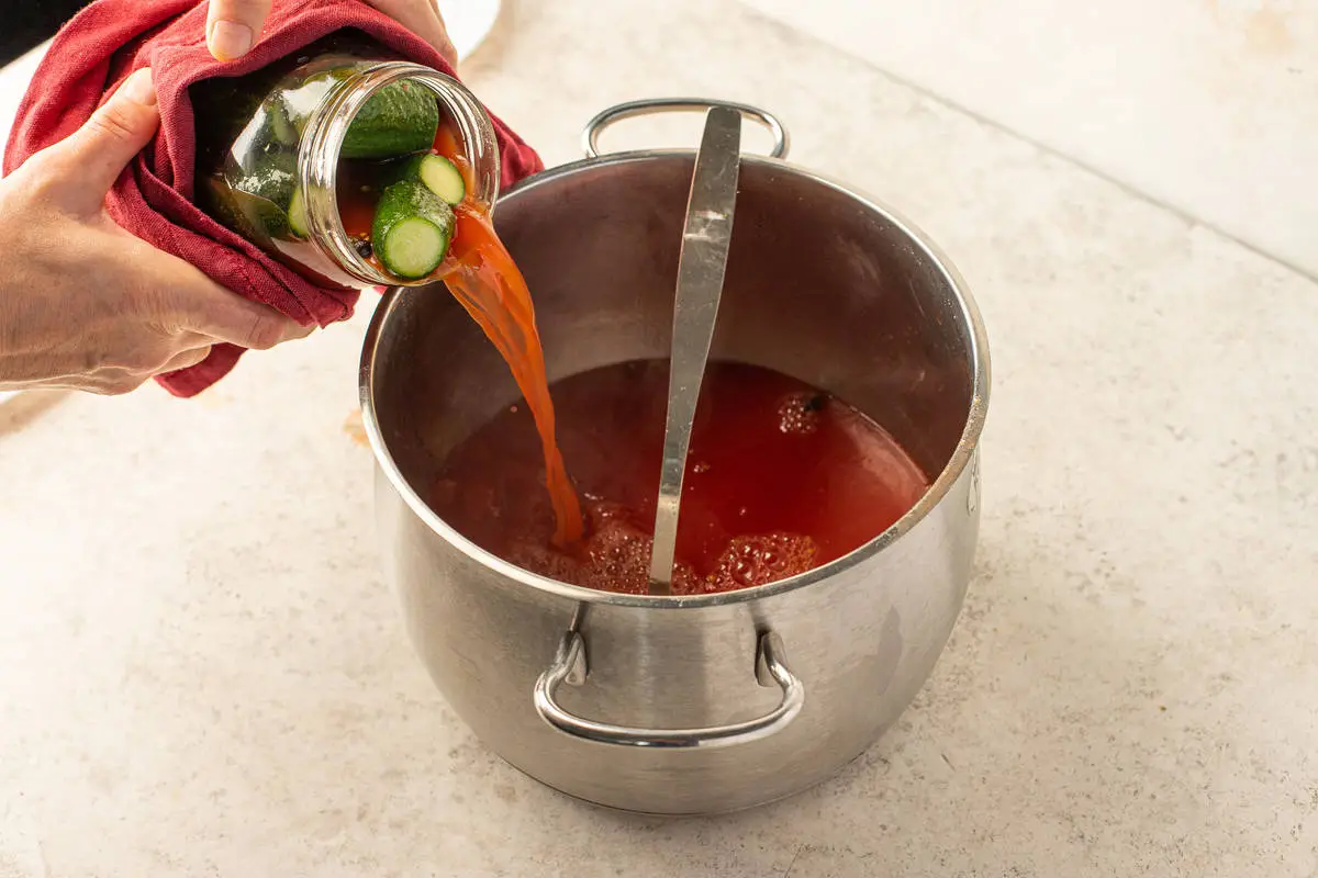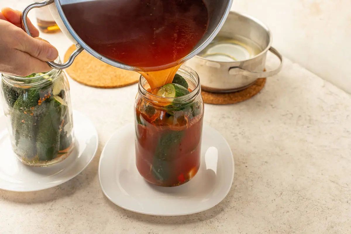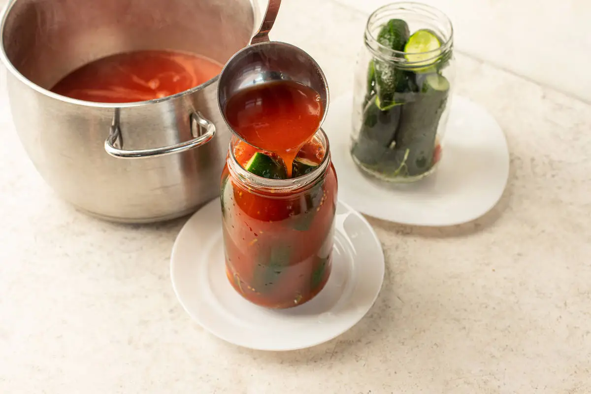 Слейте томатный маринад в кастрюлю и вскипятите его повторно. Затем залейте в банки с огурцами и оставьте ещё на 5 минут.