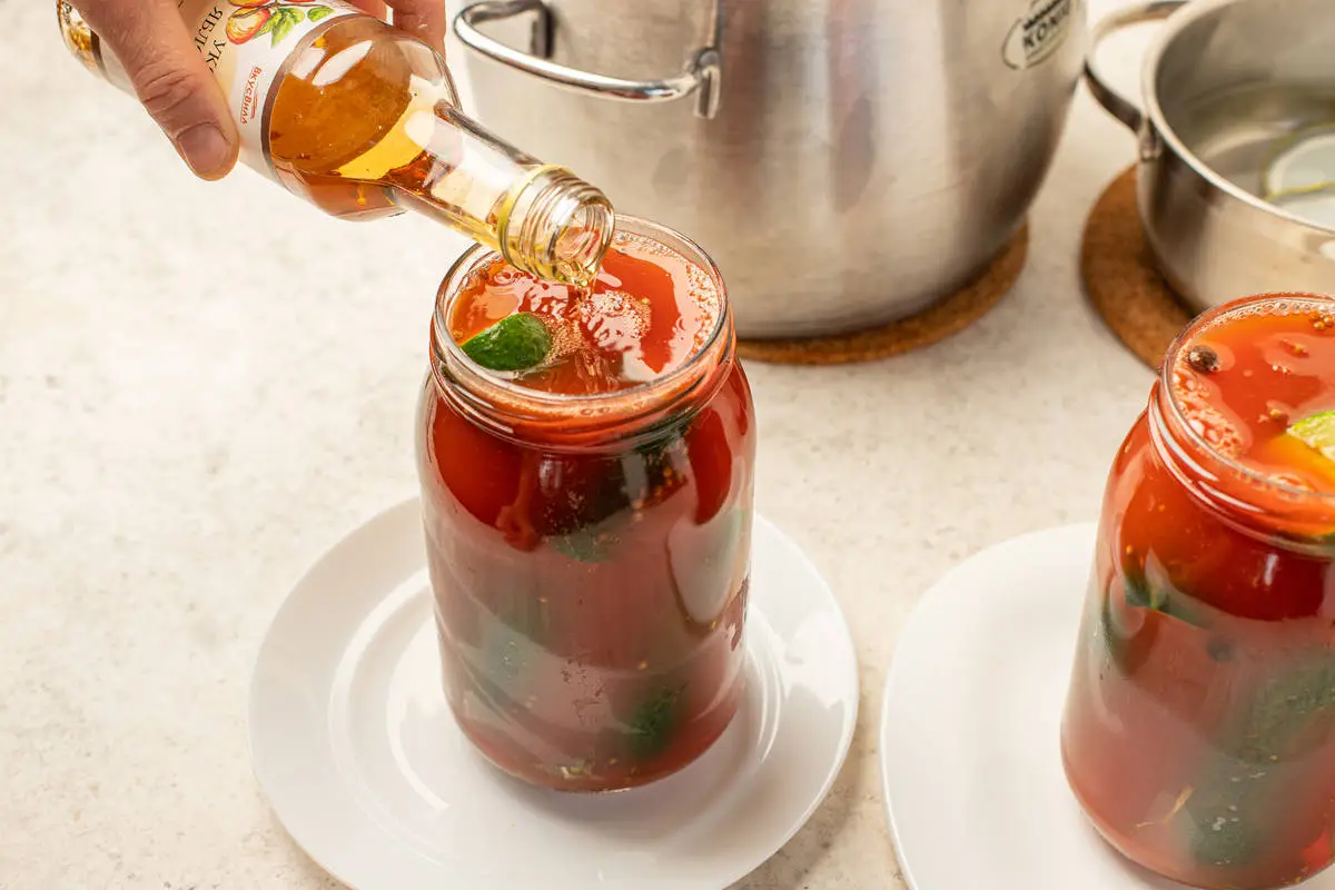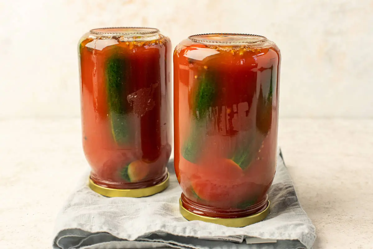Томатный маринад подходит для маринованных огурцов не хуже, чем традиционный рассол из воды, соли, сахара и уксуса. Томатный сок для этого рецепта можно купить в магазине или приготовить самостоятельно с помощью соковыжималки. А получившийся маринад обладает насыщенным вкусом — его будет приятно выпить, когда огурцы в банке закончатся.