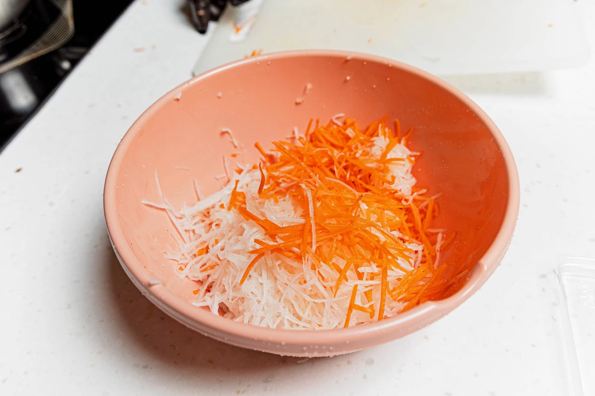 Дайкон и морковь очистите, измельчите на тёрке для моркови по-корейски.